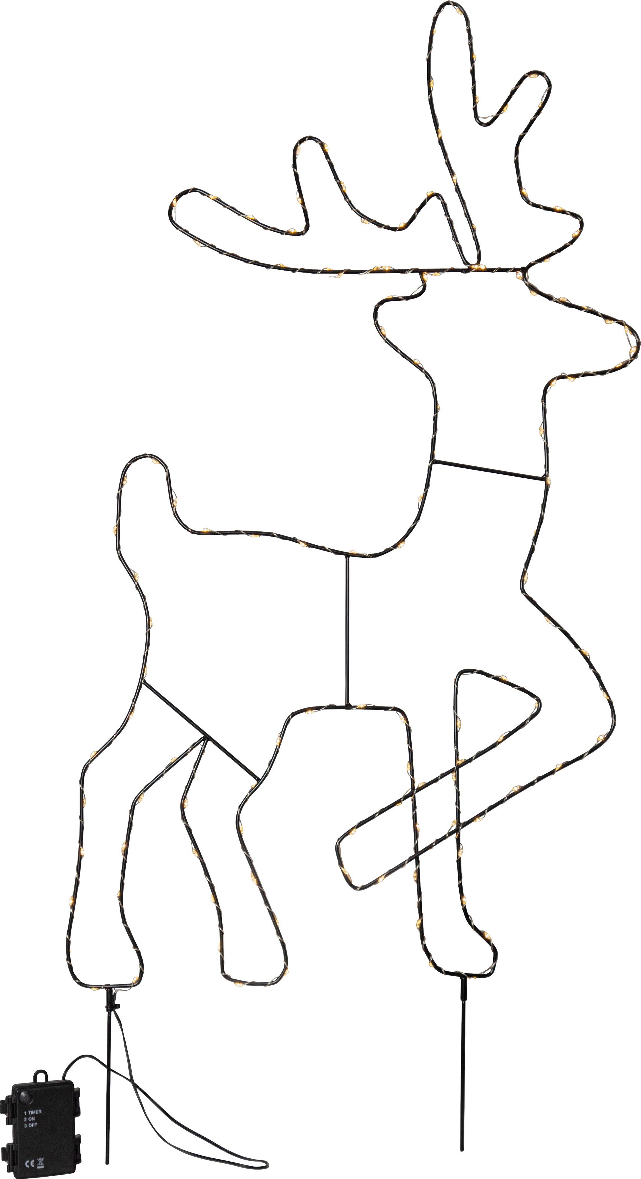 Poron muotoinen metallikehys. Paristokäyttöinen ulkokoriste ajastintoiminnolla. Helppo sijoittaa ruukkuun tai maahan. Korkeus n. 85 cm. Irrotettavat maapiikit. 130 lämpimän valkoista LED-valoa valaisee kauniisti.