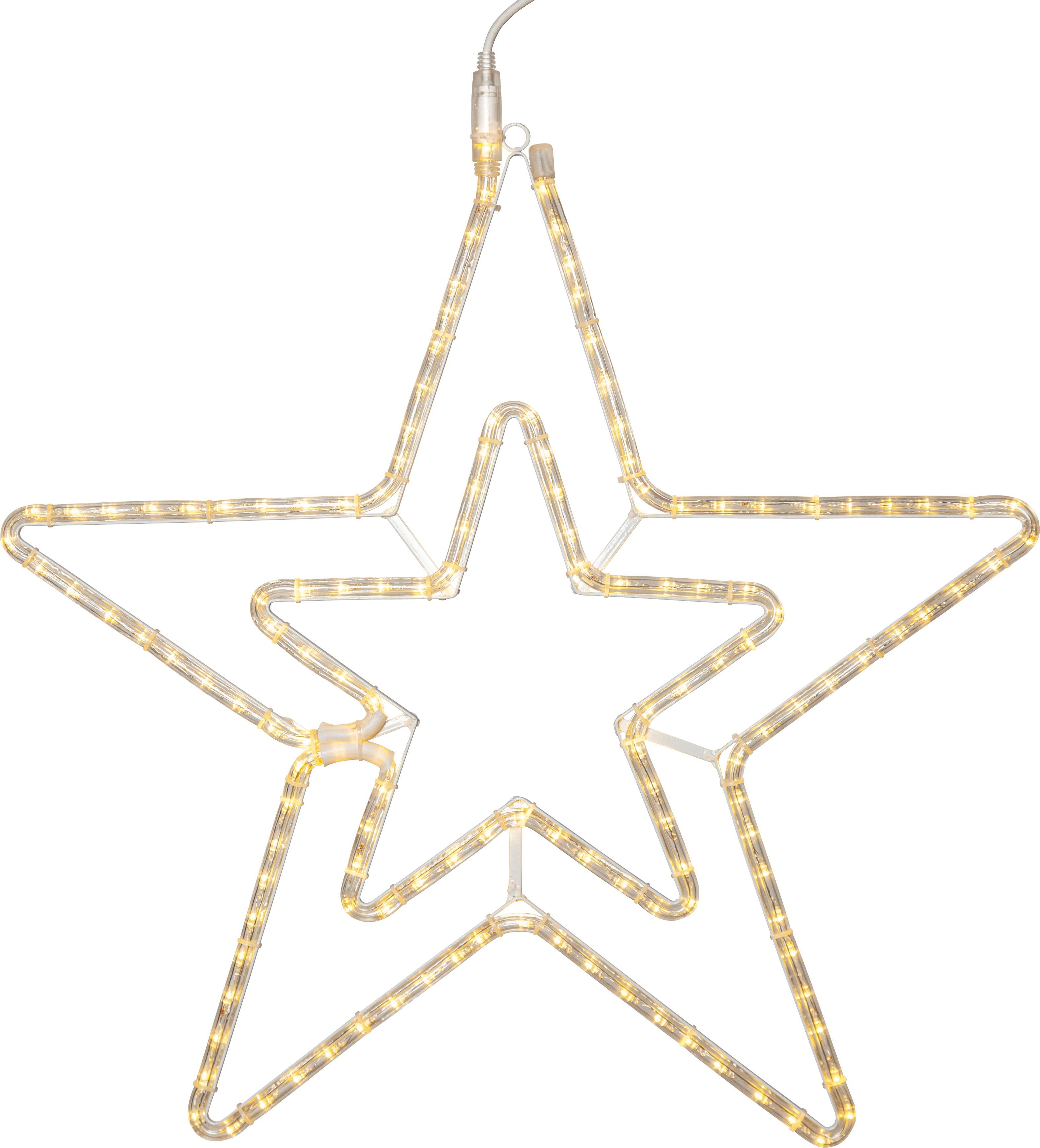 Tähden mallinen siluetti ulkokäyttöön. Kaunis koriste puutarhaan tai talon etupuolelle. Tähdessä on 144 lämpimän valkoista LED-valonlähdettä, jotka valaisevat kauniisti pimeässä. 230 V, kuminen johto 1,8 metriä.