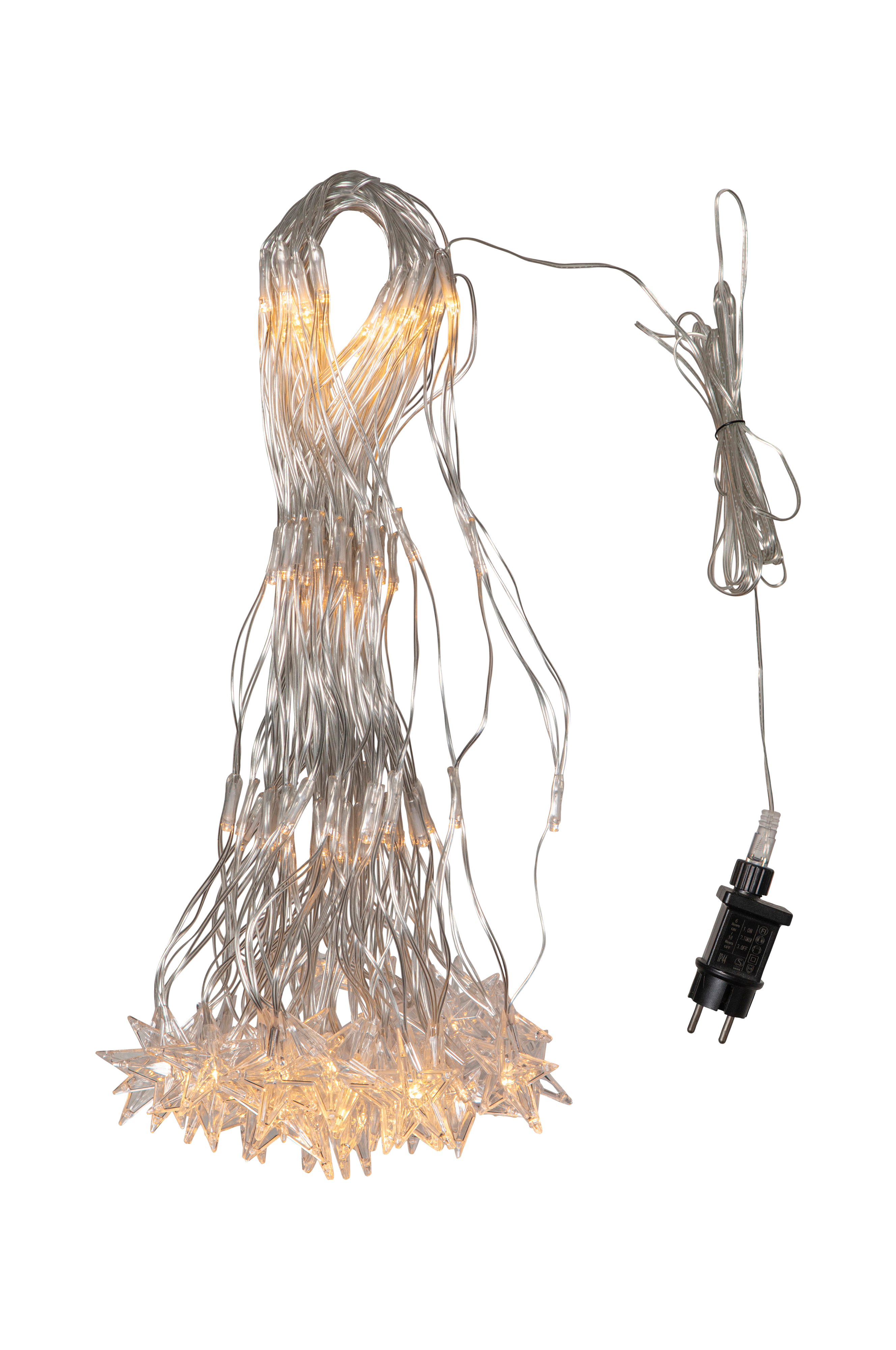 Valoverkko läpinäkyvässä kaapelissa, koko 4.8x0.4m. Alareunassa roikkuu 40 tähteä, yhteensä verkossa on 160 lämpimän valkoista lediä, jotka antavat kauniin hehkun. Ip44-luokiteltu muuntaja 5 metrin käynnistyskaapelilla. Valaise esimerkiksi parveke, talon seinä tai katto tällä koristeellisella verkolla.