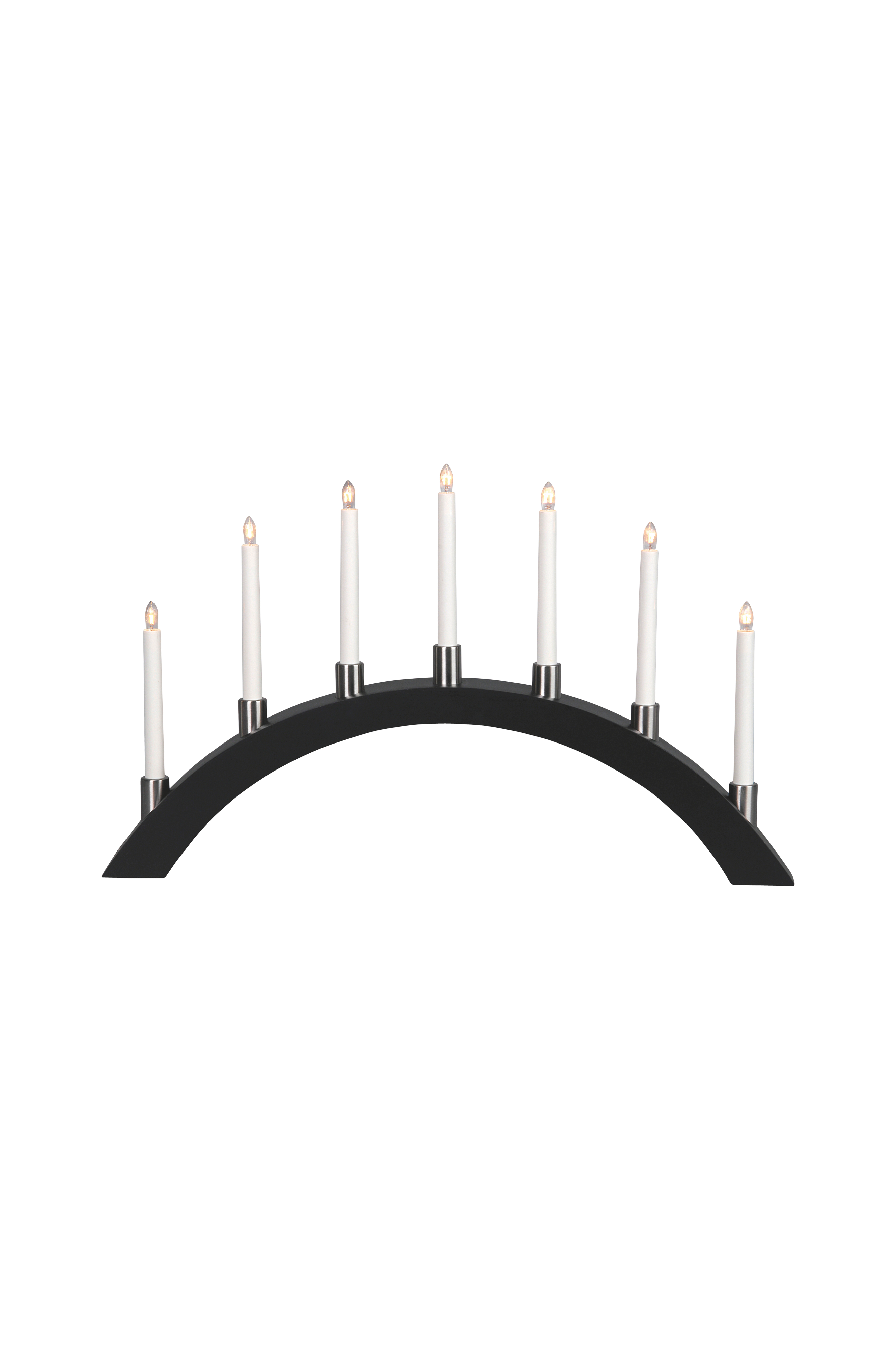 Leveys 67 cm, korkeus 40 cm. 7-haarainen kynttelikkö puuta, kynttilöiden kiinnikkeet metallia. Johdon pituus 1,8 metriä.