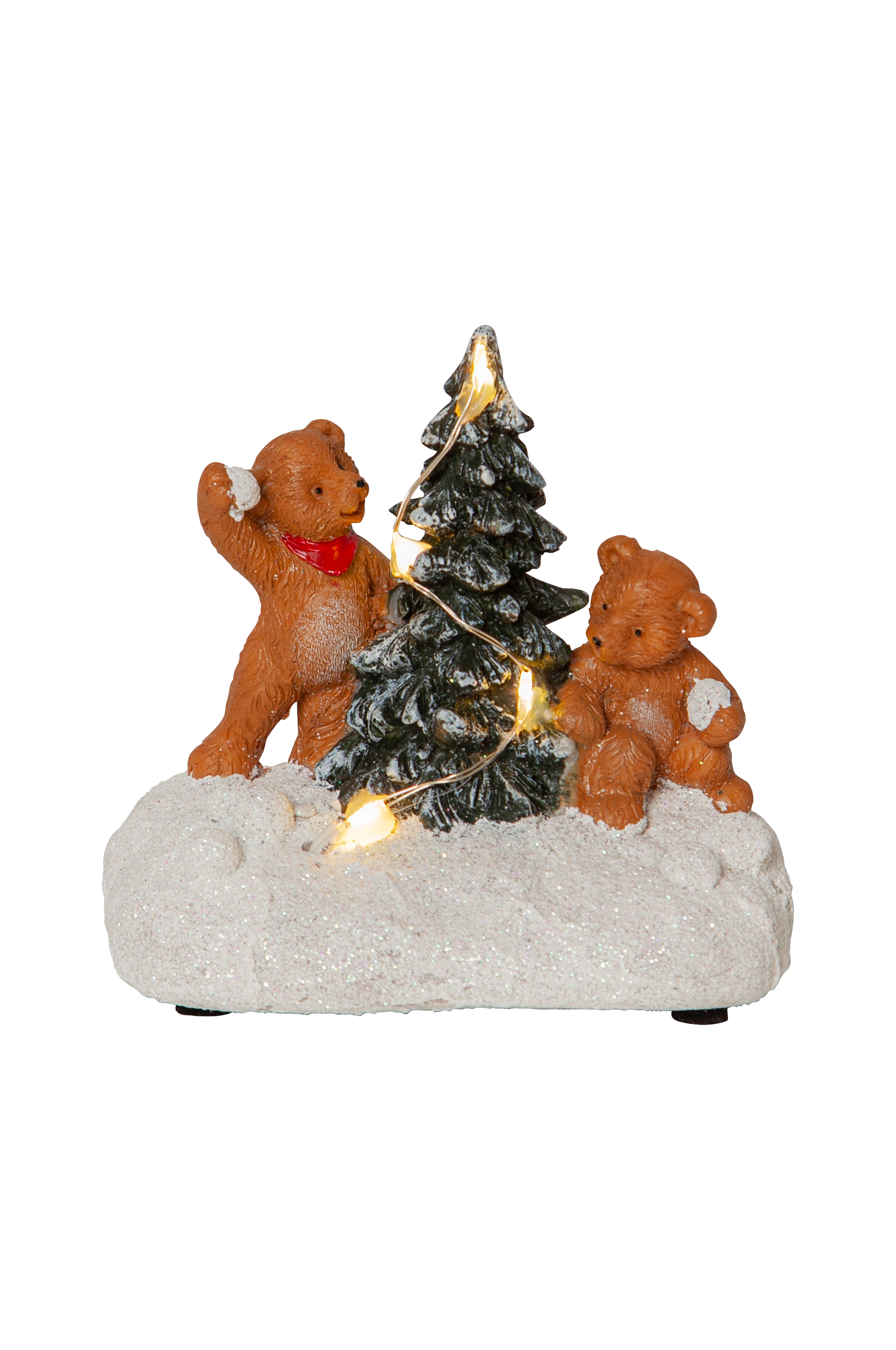 "Joulua odotellessa Ted leikkii ja telmii ystäviensä kanssa lumessa. Sisällä odottaa kuuma kaakao ja ihana takka." Kaksiosainen setti on miellyttävä joulukoriste koko talveksi. Pienet LED-lamput loistavat kauniisti, kun koriste on päällä. Paristokäyttöinen ja ajastintoiminto.