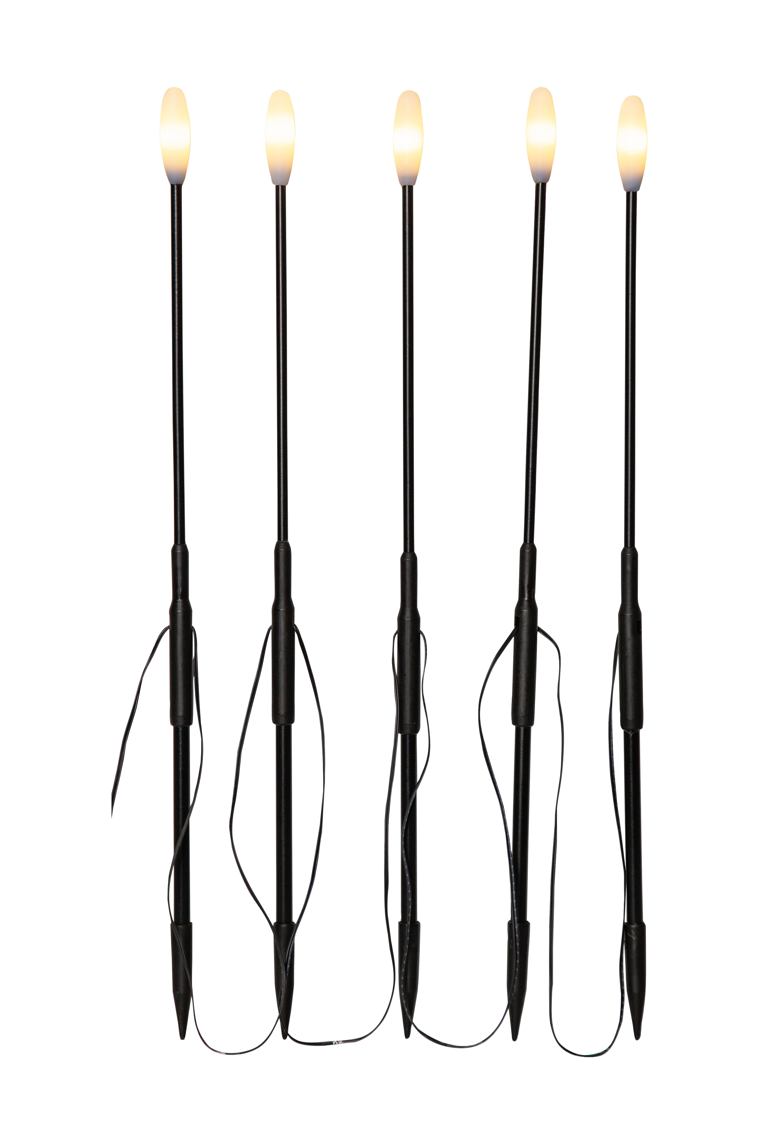 Koristeellisessa ulkovalaisimessa on viisi sauvan muotoista valaisinta, joissa on lämpimän valkoinen valo. Sauvojen välinen etäisyys 50 cm. Musta johto. Tyylikäs koriste puutarhaan tai esim. kukkaruukkuun.