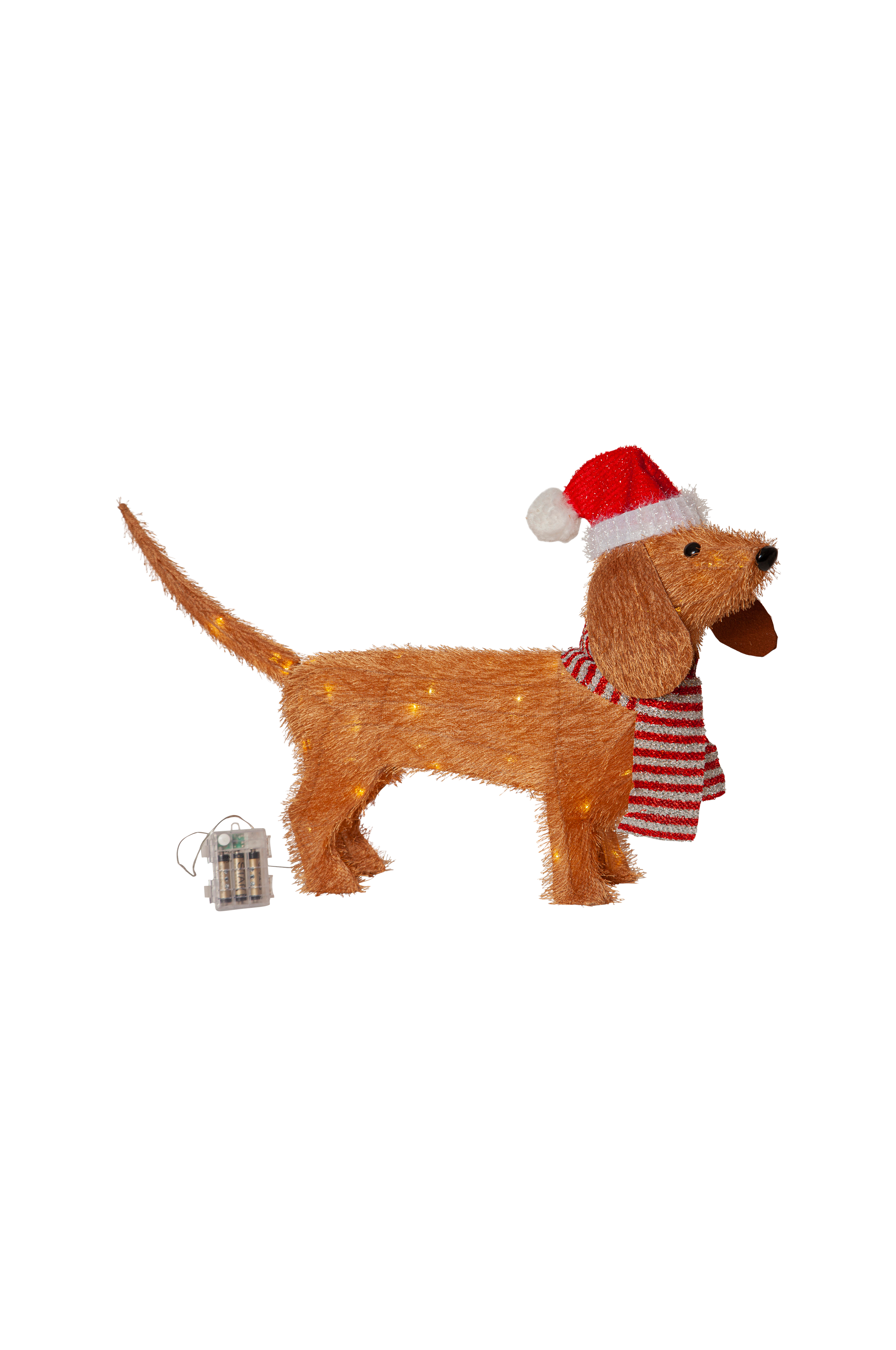 Hauska koiran muotoinen joulukoriste. Leveys 70 cm ja korkeus n. 42 cm. Sopii sisä- ja ulkokäyttöön. Ulkokäytössä sijoita tuote suojattuun paikkaan, esim. katoksen alle, kankaan kunnon säilyttämiseksi. Paristokäyttöinen koriste ajastintoiminnolla.