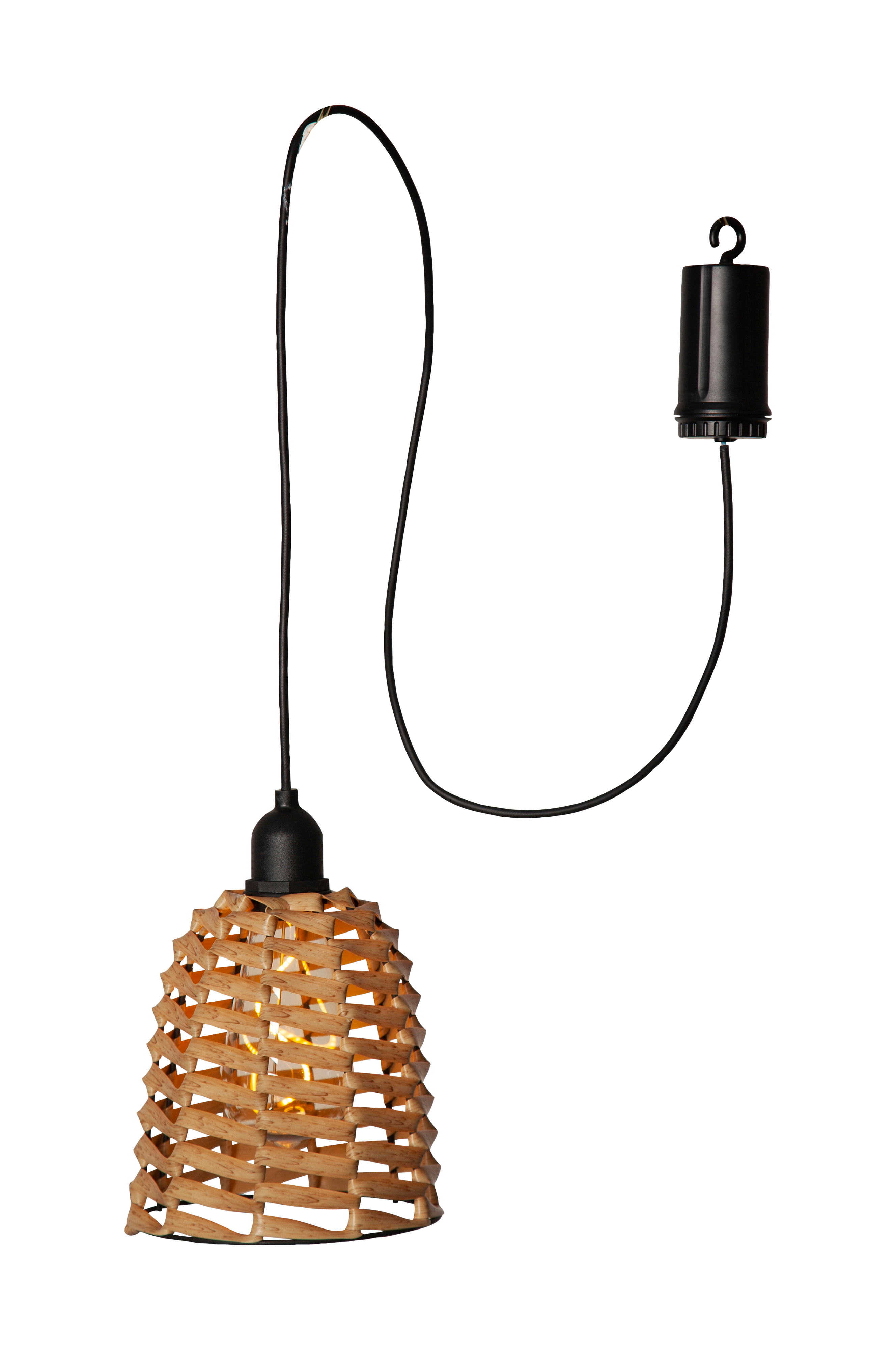 Elegantti lampunvarjostin ruskeaa polyrottinkia. Sisä- ja ulkokäyttöön. LED-filamenttilamppu, jossa spiraalin muotoinen hehkulanka. Paristokäyttöinen ulkokoriste ajastintoiminnolla.