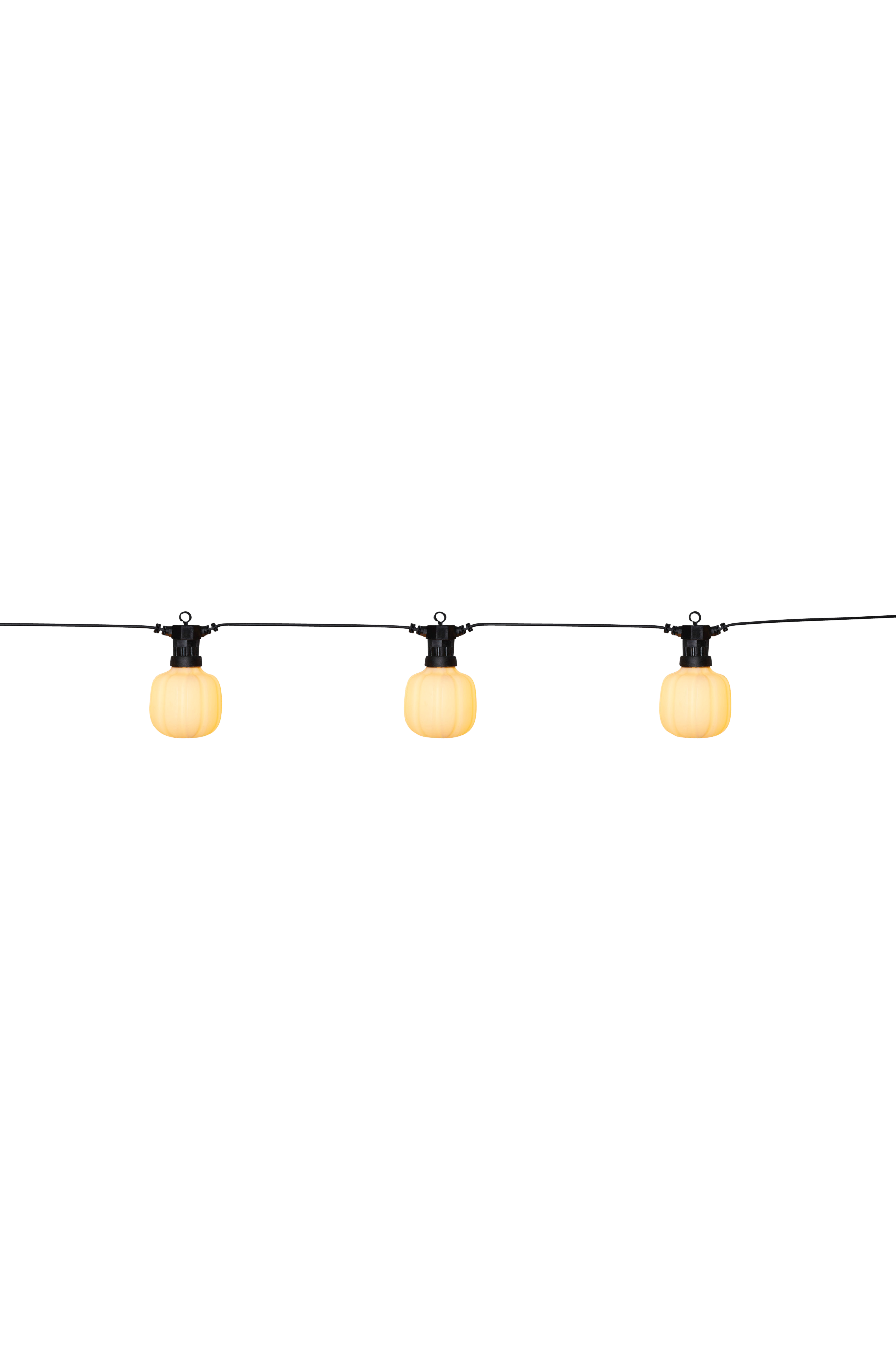 Valoköynnös, jossa valkoiset huurretut kuoret ja 10 LED-valonlähdettä. Ulkokäyttöön. Lamppujen korkeus 12 cm ja halkaisija 8 cm. Köynnöksen pituus 5 metriä. Maapiikissä 5 m:n kuminen liitäntäkaapeli. Värilämpötila 2100 K. Lamppujen välinen etäisyys 50 cm. IP44. Paloaika n. 10000 tuntia.