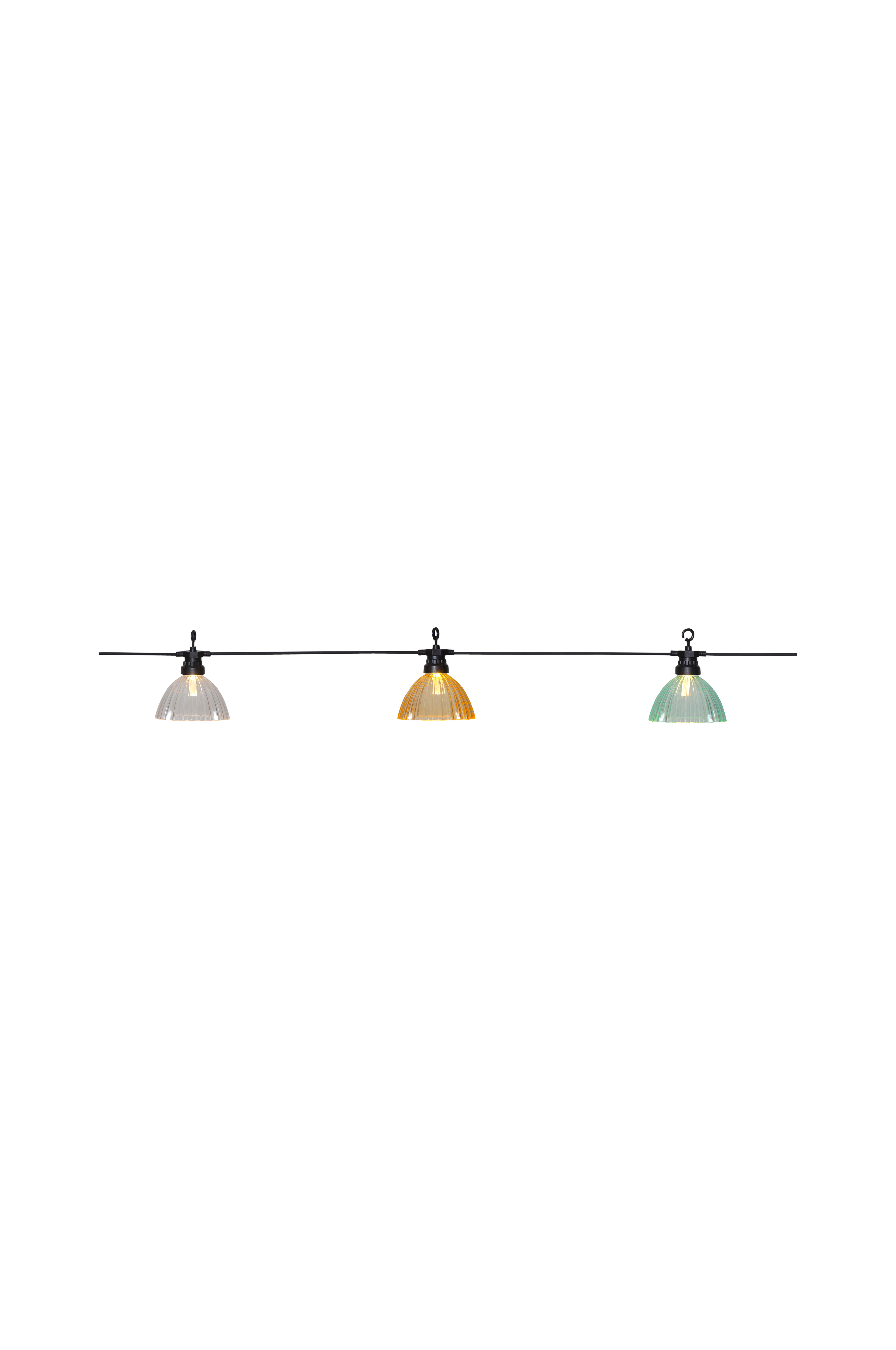 Tyylikäs valosarja, jossa 12 pientä savunväristä lampunvarjostinta. Ihana valosarja sopii sekä arkeen että juhlaan. Valaisee kauniisti pimeässä. Muuntaja: 3 V DC 2,1 W, IP44, Schuko-pistoke. Liitäntäjohdon pituus 500 cm. Lamppujen välinen etäisyys 45 cm.