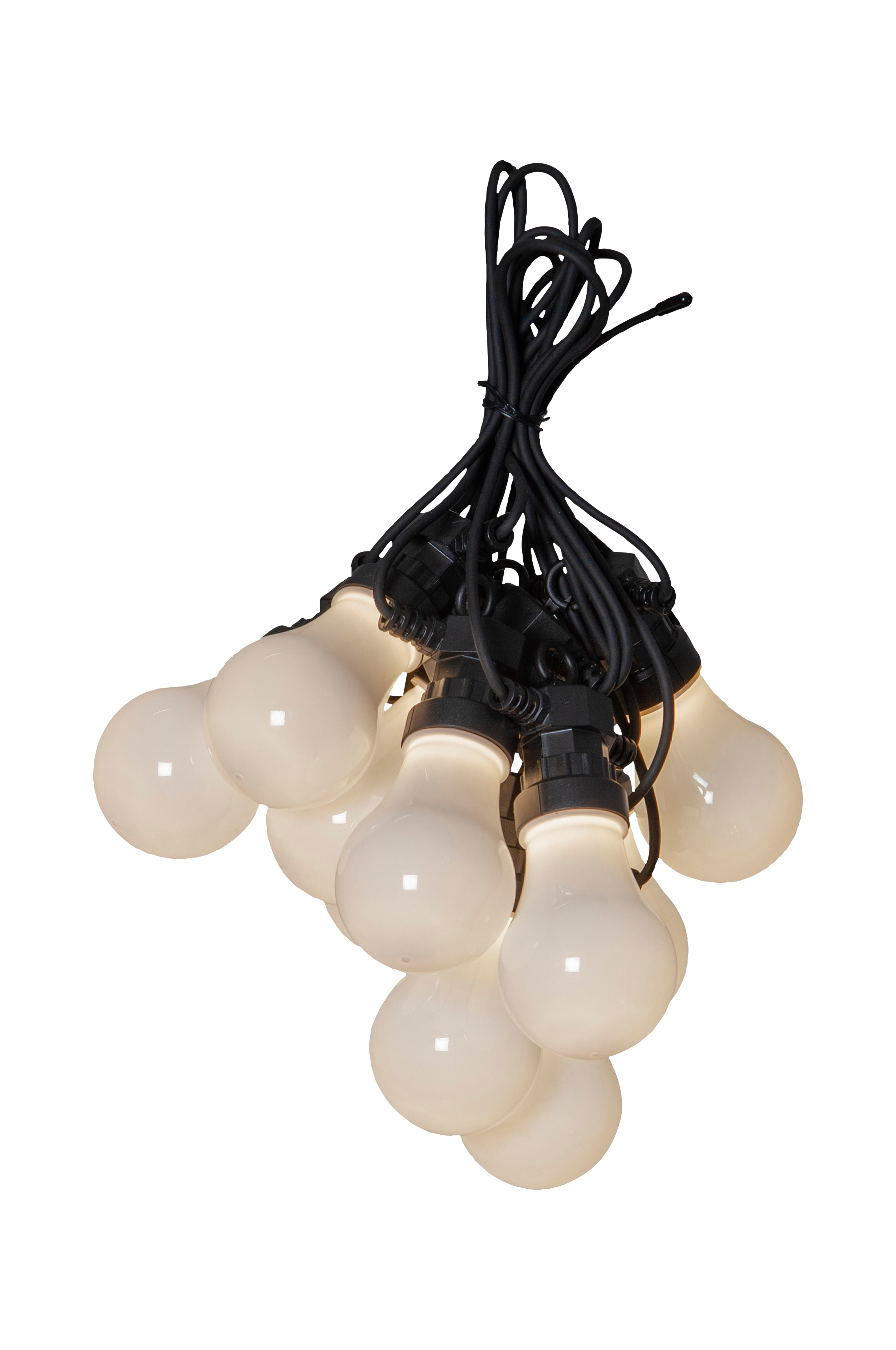 Juhlavalosarja. 10 opaalinväristä kupua, joissa sisällä SMD LED. Ihana valosarja sopii sekä arkeen että juhlaan. Antaa kauniin lämpimän valkoisen valon pimeässä. Muuntaja: 15 V DC 3 W, IP44, Schuko-pistoke. Liitäntäjohdon pituus 500 cm. Lamppujen välinen etäisyys 45 cm.