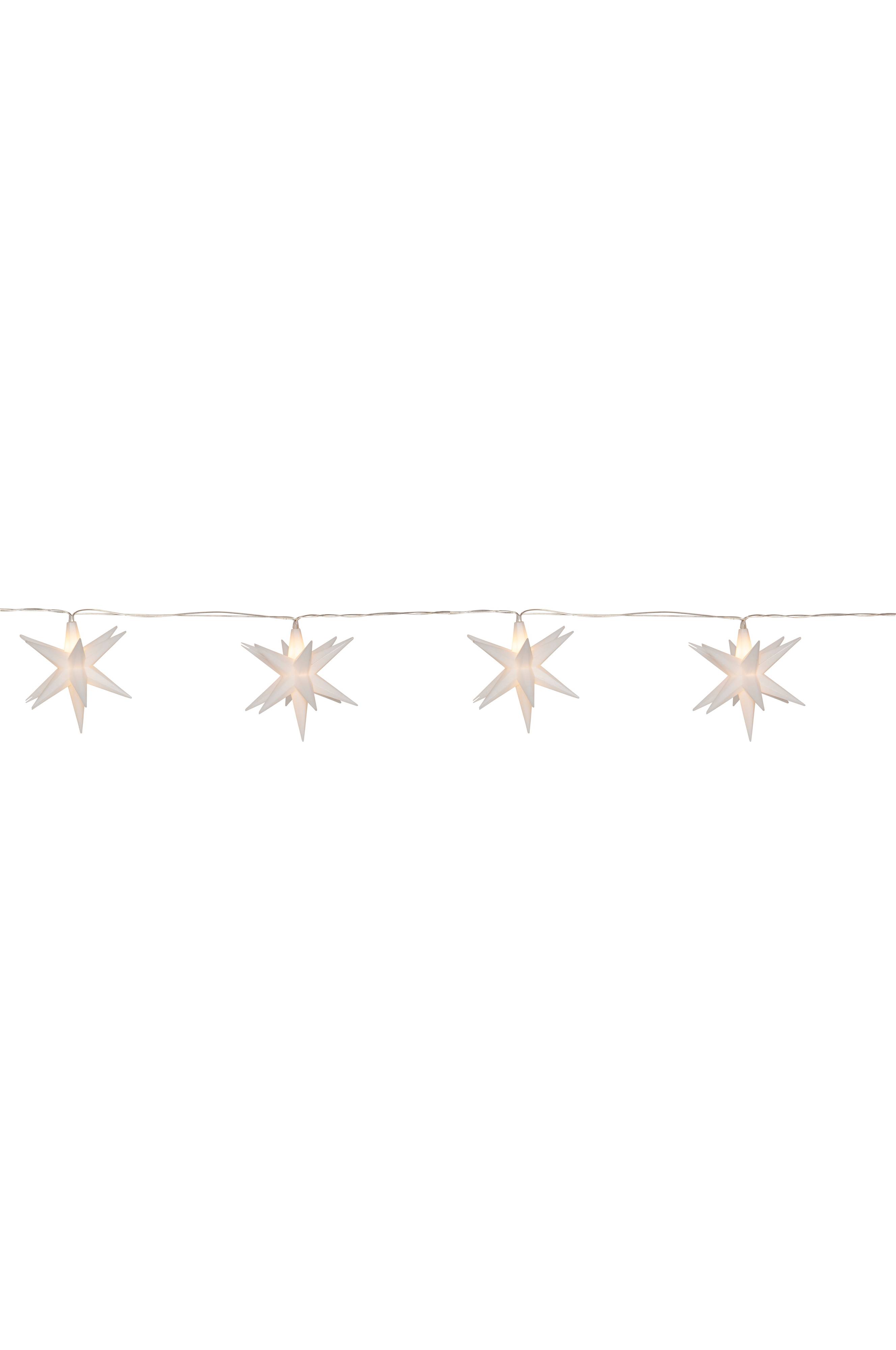 Valosarjassa on lämpimän valkoinen valo ja kahdeksan valkoista Moravian tähteä. Sisäkäyttöön, paristokäyttöinen valosarja ajastintoiminnolla. Klassinen joulukoriste, joka kohottaa joulutunnelmaa kotona.