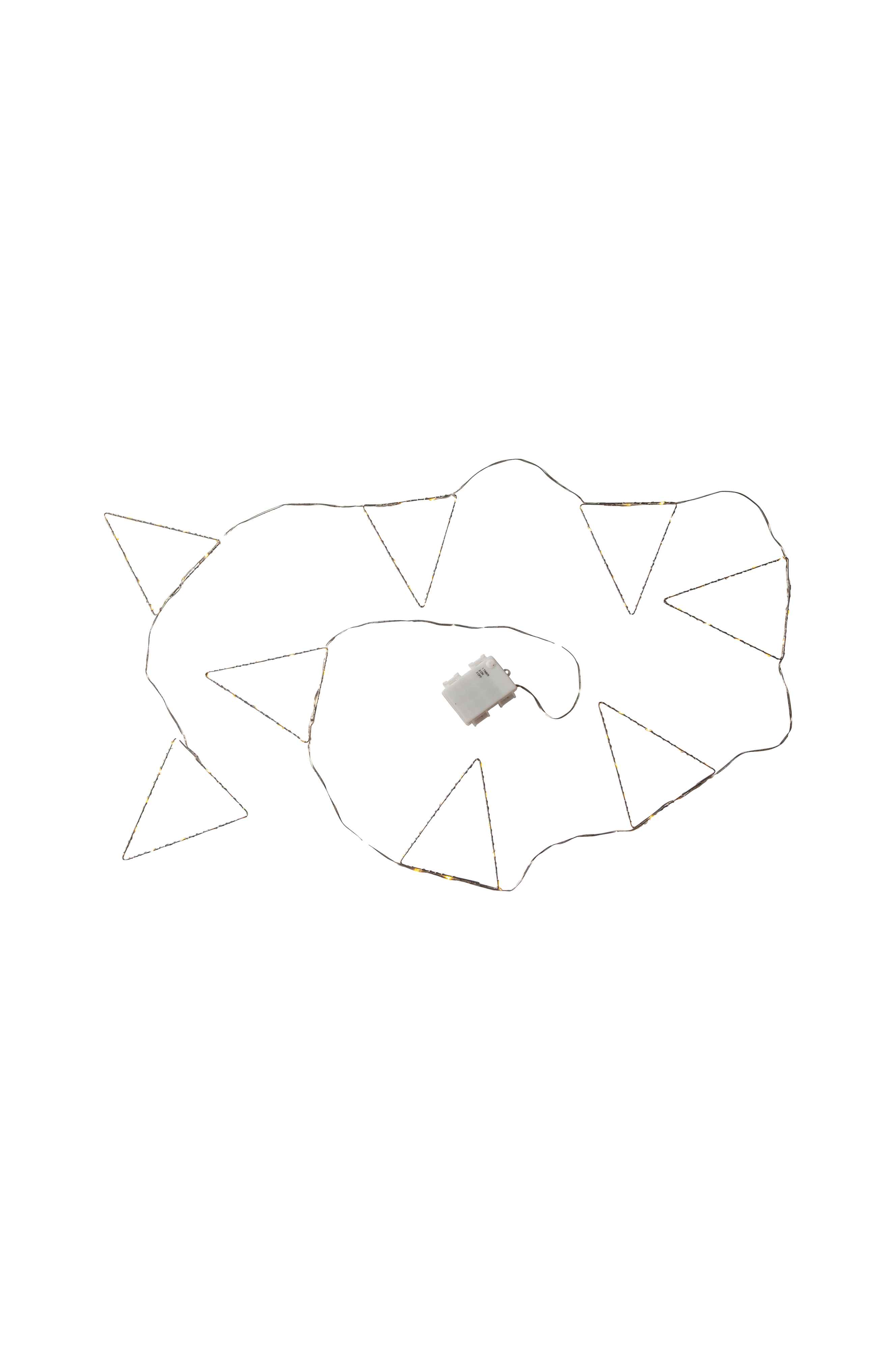 Koristeellinen valoketju hopeanvärisillä metalliviireillä. Jokaisessa viirissä on kastepisaravaloketju, jossa on 11 lämpimän valkoista lediä, jotka on kiedottu kehyksen ympärille. Paristokotelo ulkokäyttöön ajastintoiminnolla. Täydellinen sekä arkeen että juhliin.