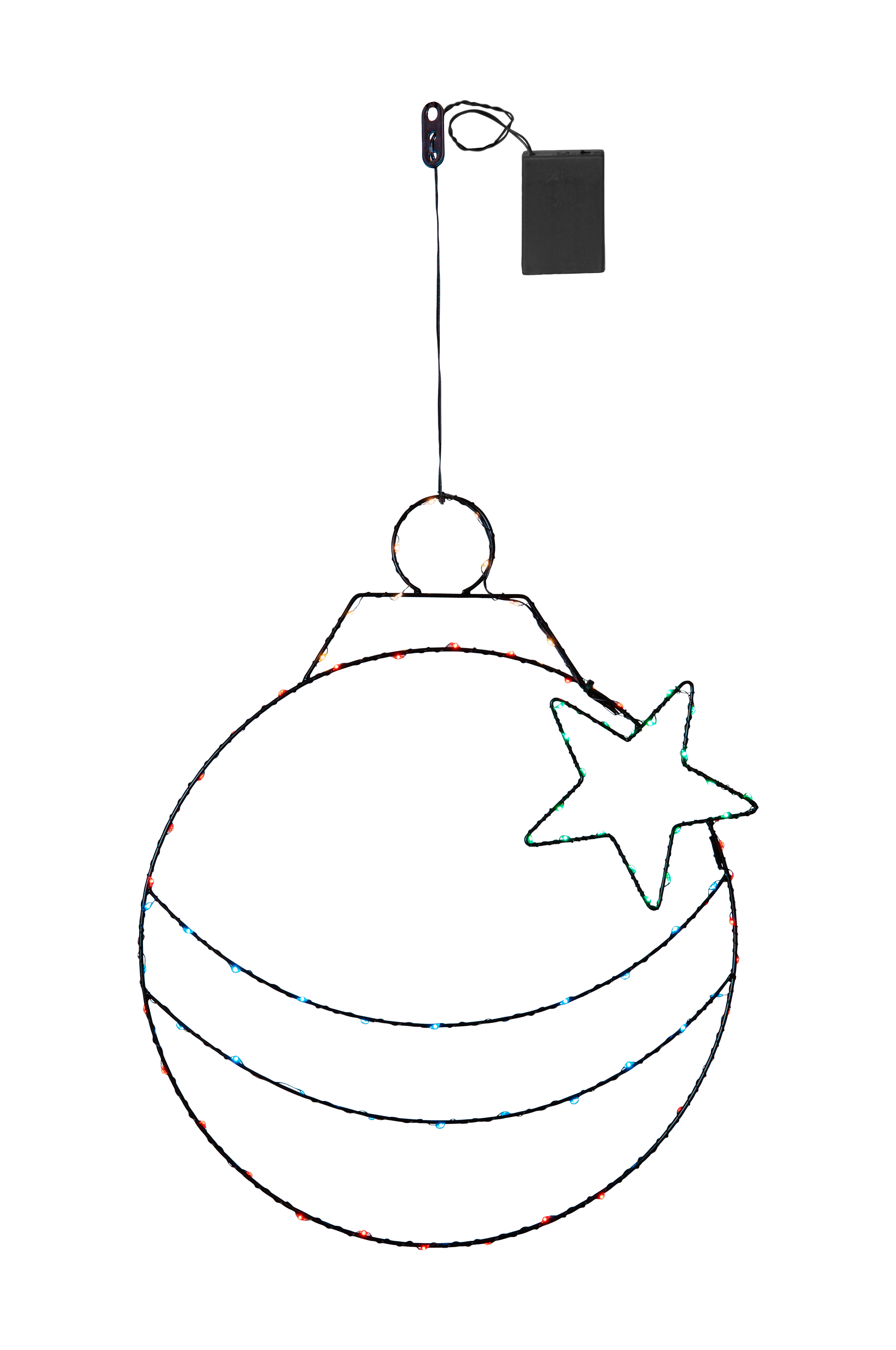 Paristokäyttöinen värikäs siluetti joulupallon muodossa. Kiva ripustaa ikkunaan tai seinää vasten. Pienet led-pisteet hehkuvat kauniisti punaisena, vihreänä, sinisenä ja valkoisena, kun tuote on päällä. Kiva koriste jouluksi ja adventiksi. Tuotteessa on ajastintoiminto.