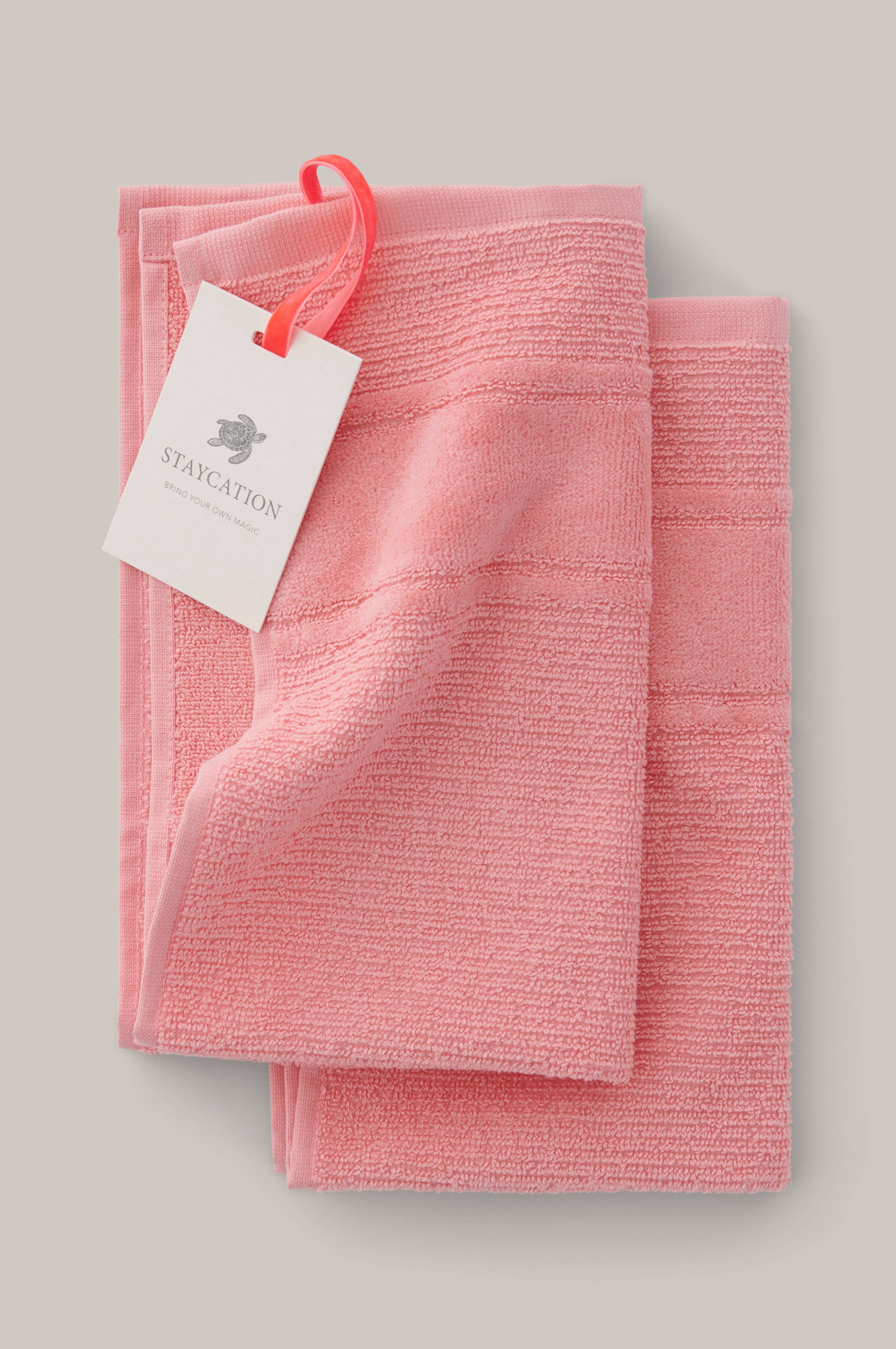 Pyyhkeet, 2/pakk. Pehmeää, kevyesti pintakuvioitua puuvillafroteeta. Veluuriraita alhaalla. Paino 520 g/m2. Valmistettu Portugalissa.