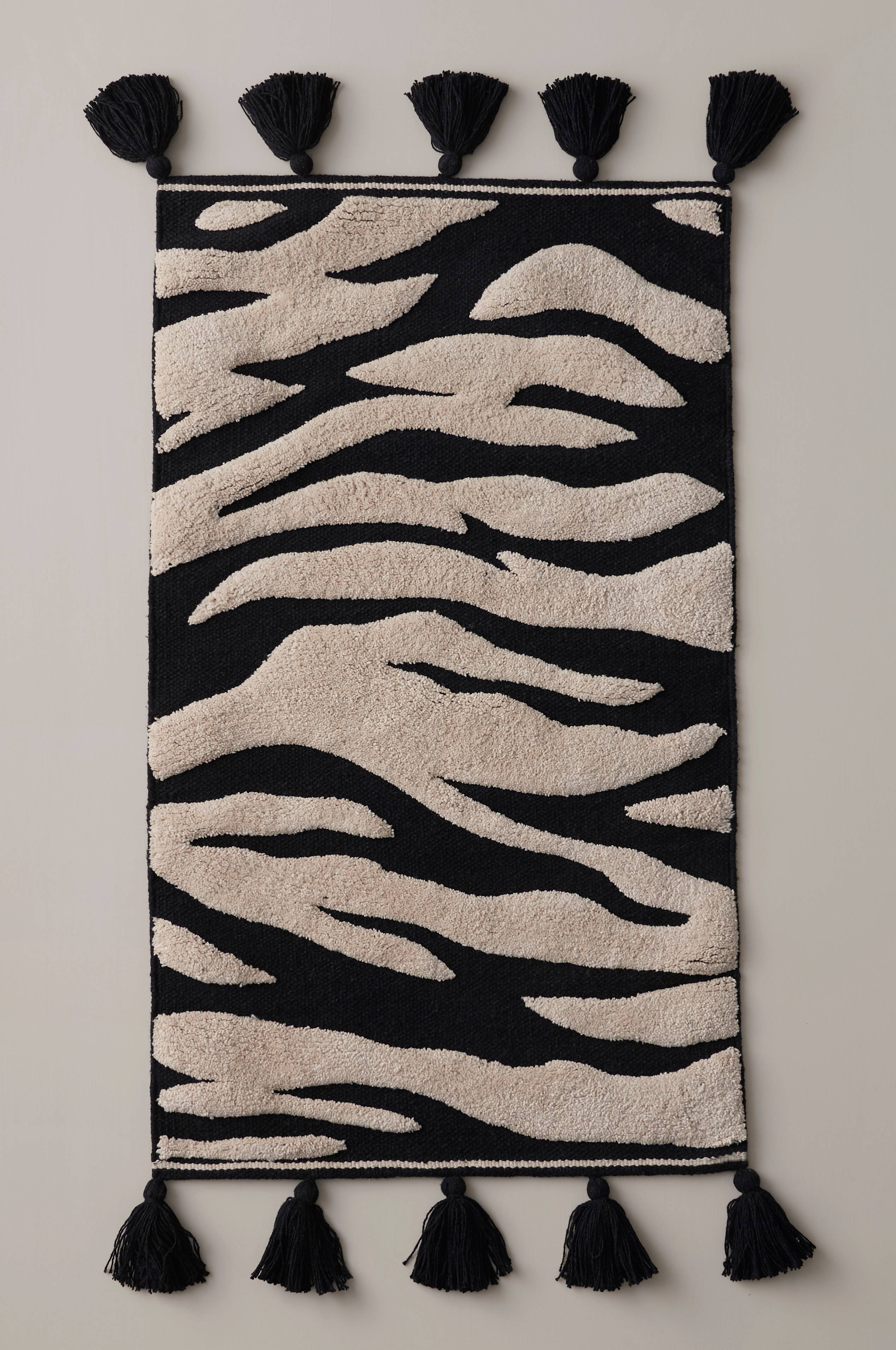 Tuftattu, paksu ja pehmeä kylpyhuonematto, jossa pintakuvio. Kangasboordit ja 5 tupsua lyhyillä sivuilla.