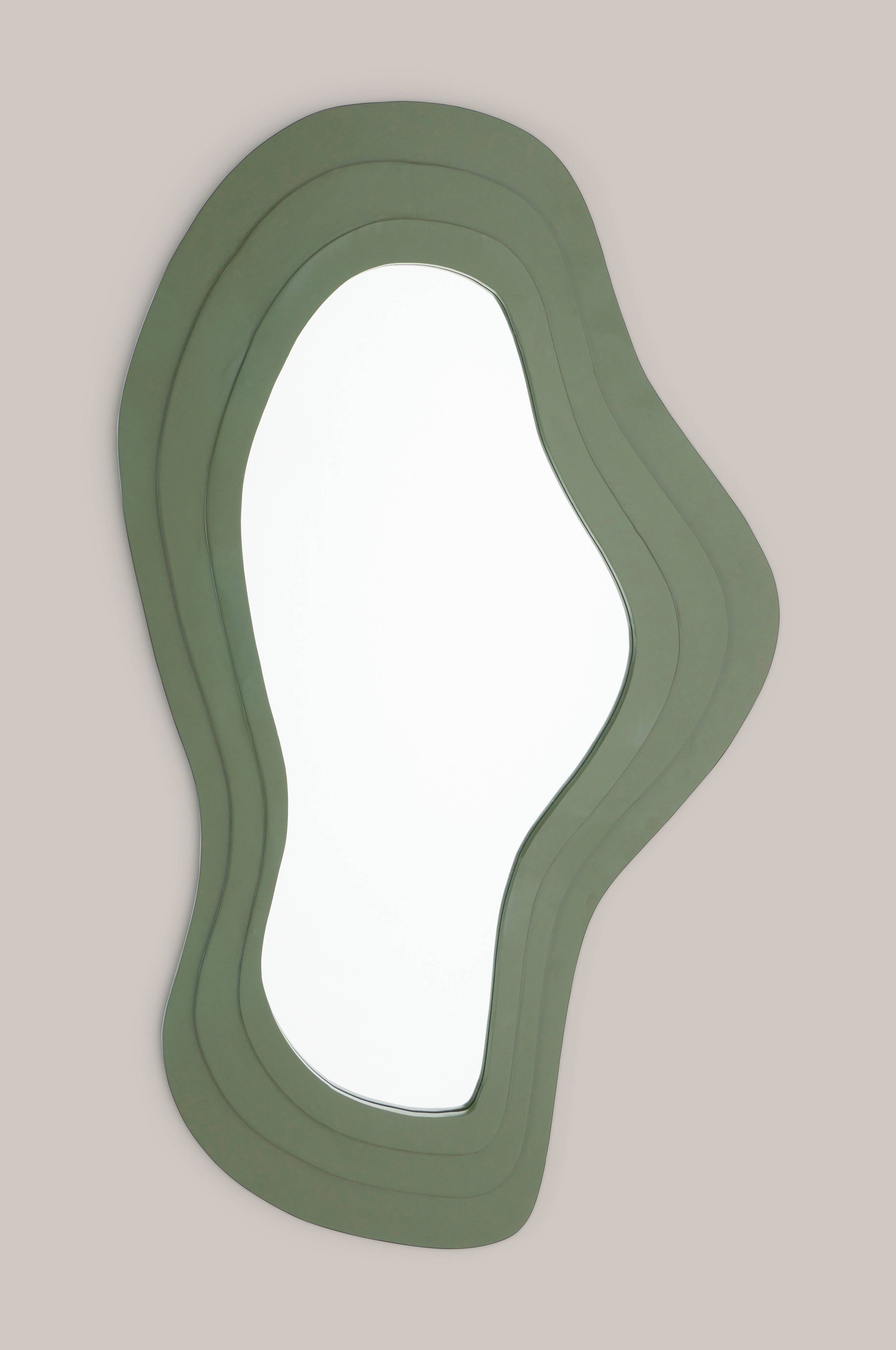 Peili, jossa epäsäännöllinen, orgaaninen muoto. Kehys maalattua MDF-levyä. Ripustetaan seinälle. Peilipinnan mitat: L 42 x K 96 cm.