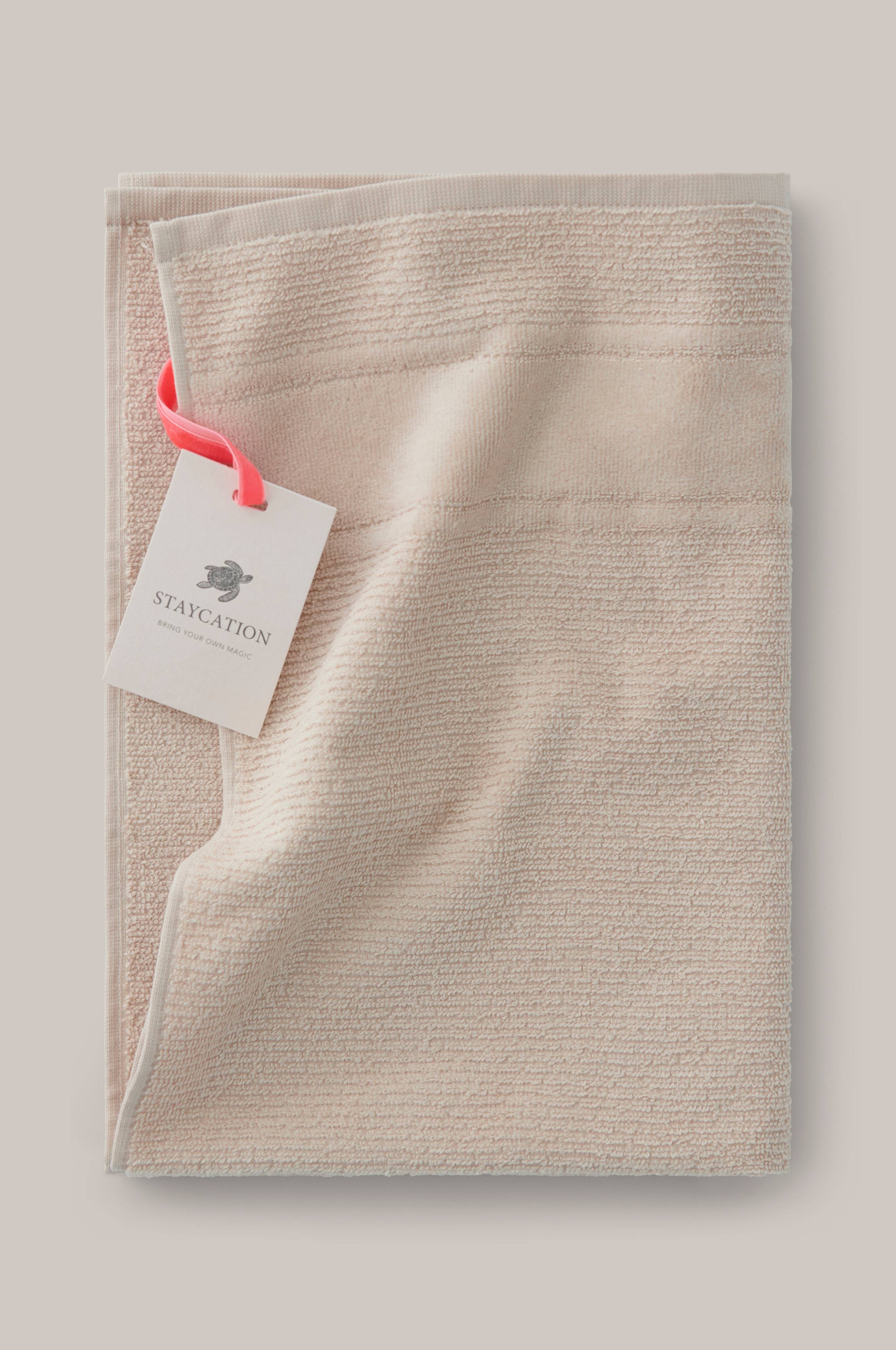 Pehmeää, kevyesti pintakuvioitua puuvillafroteeta. Veluuriraita alhaalla. Koko 50x70 cm. Paino 520 g/m2. Valmistettu Portugalissa.