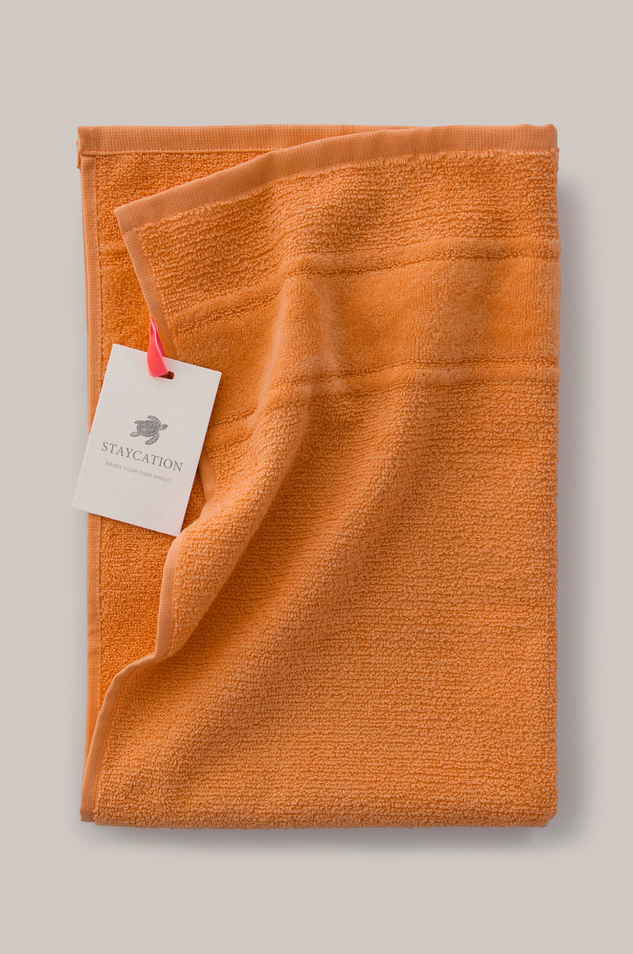 Pehmeää, kevyesti pintakuvioitua puuvillafroteeta. Veluuriraita alhaalla. Koko 50x70 cm. Paino 520 g/m2. Valmistettu Portugalissa.