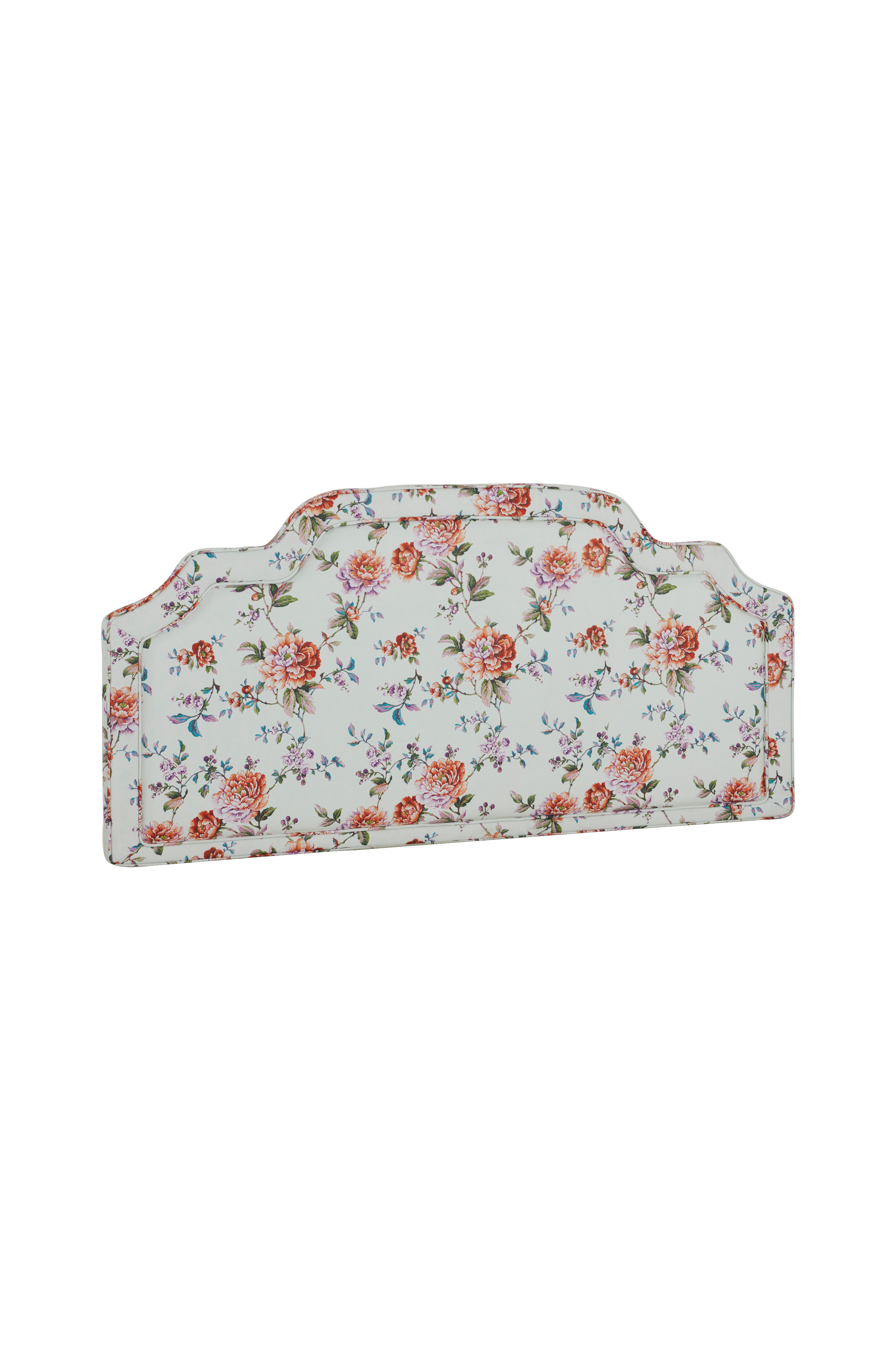 Topattu sängynpääty, jonka runko massiivipuuta ja vaneria. Päällinen polyesteriä, jossa painettu kukkakuvio, ja koristeellinen terenauhareuna, jossa sama painatus. Täyte polyesterivanua. Ripustetaan seinälle.