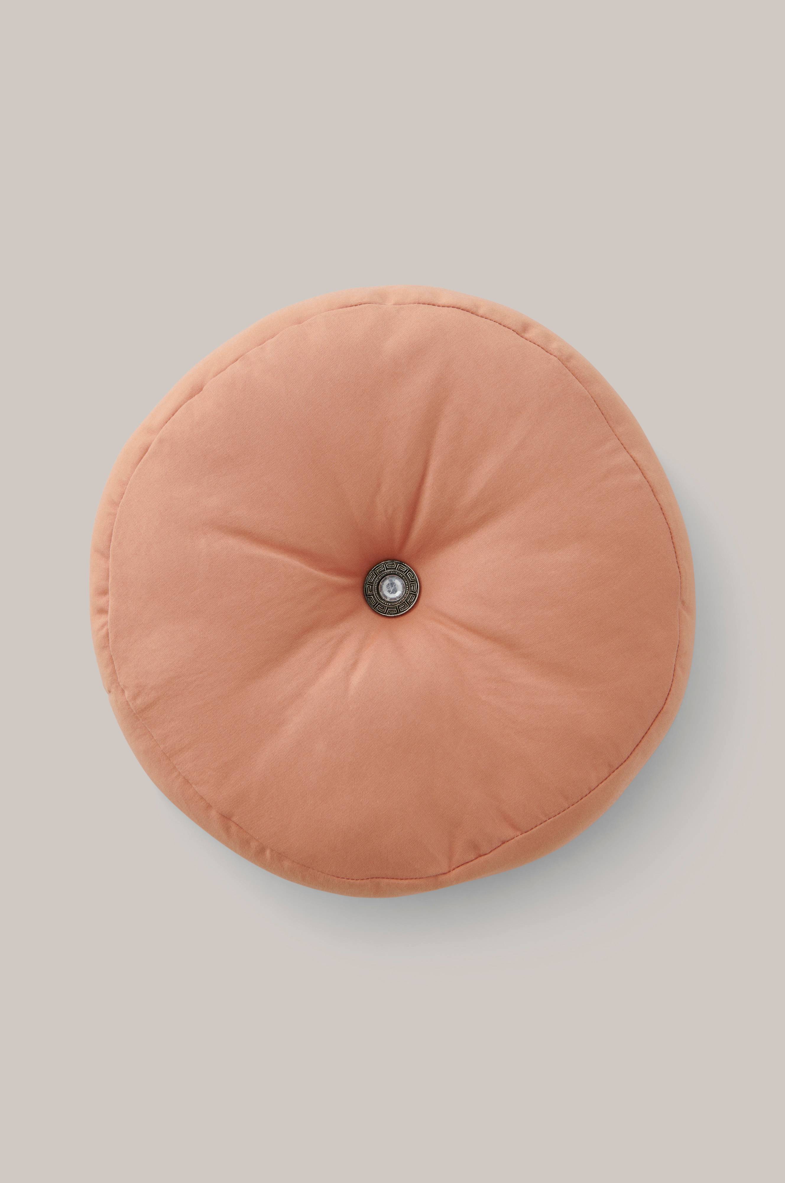 Pyöreä tyyny, jossa päällyskangas puuvillasatiinia. Langantiheys 800 TC. Timantin muotoinen muovinappi tyynyn keskellä etupuolella. Täyte silikonoitua ontelokuitua.