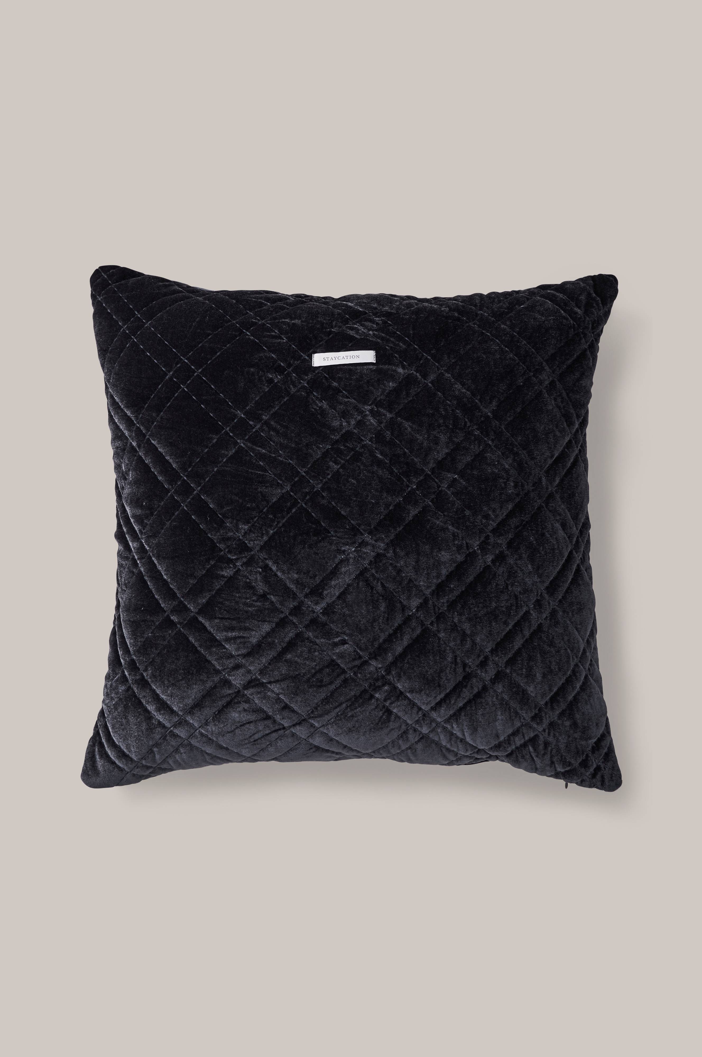 Tikattu tyynynpäällinen kauniisti hohtavaa loimusamettia. Tikkaus molemmilla puolilla ja vetoketju alareunassa. Täyte 120 g polyesteriä. Koko 65x65 cm.