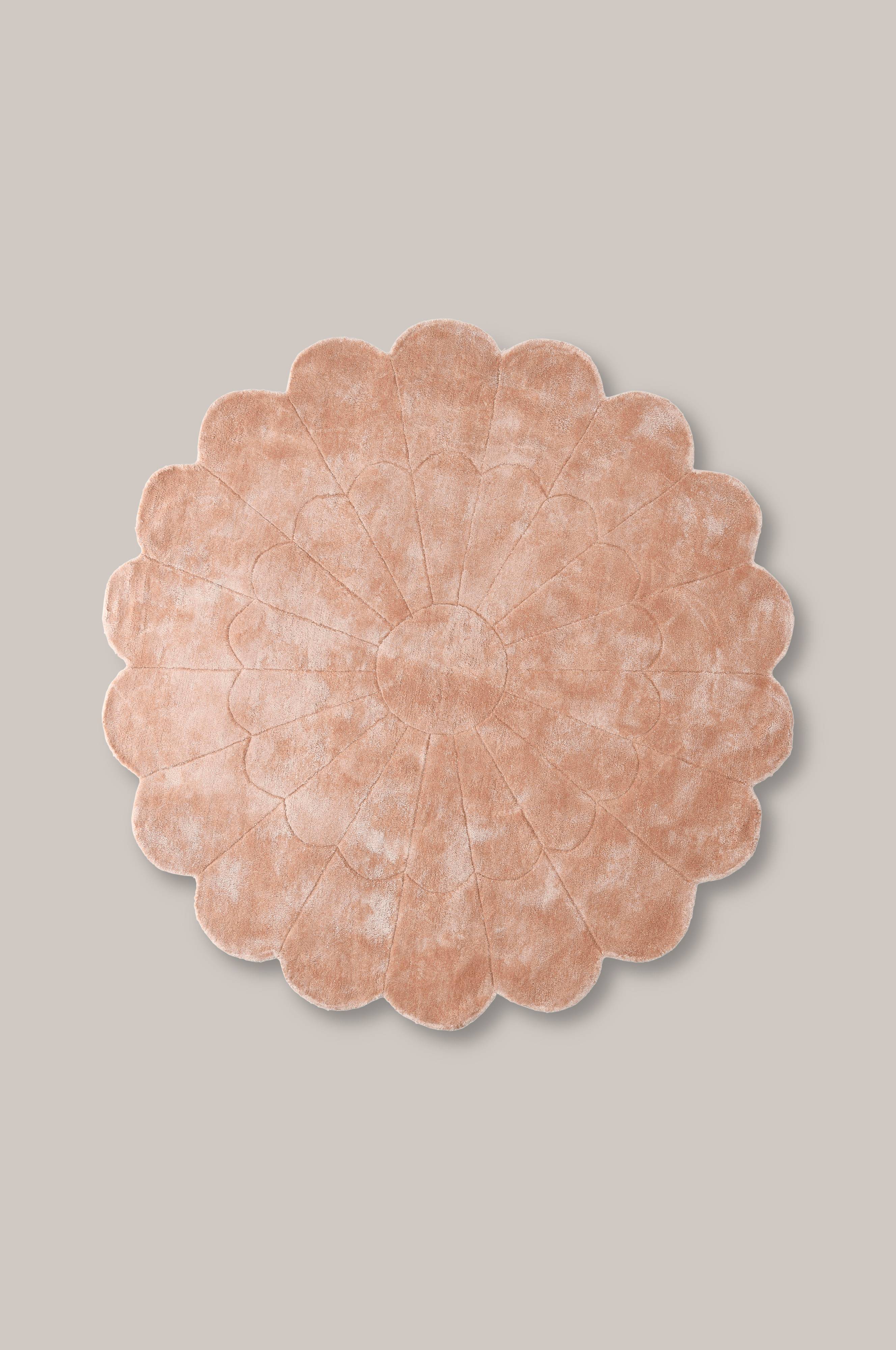 Käsin tuftattu viskoosimatto, jossa on kohokuvio. Korkeus 1 cm.