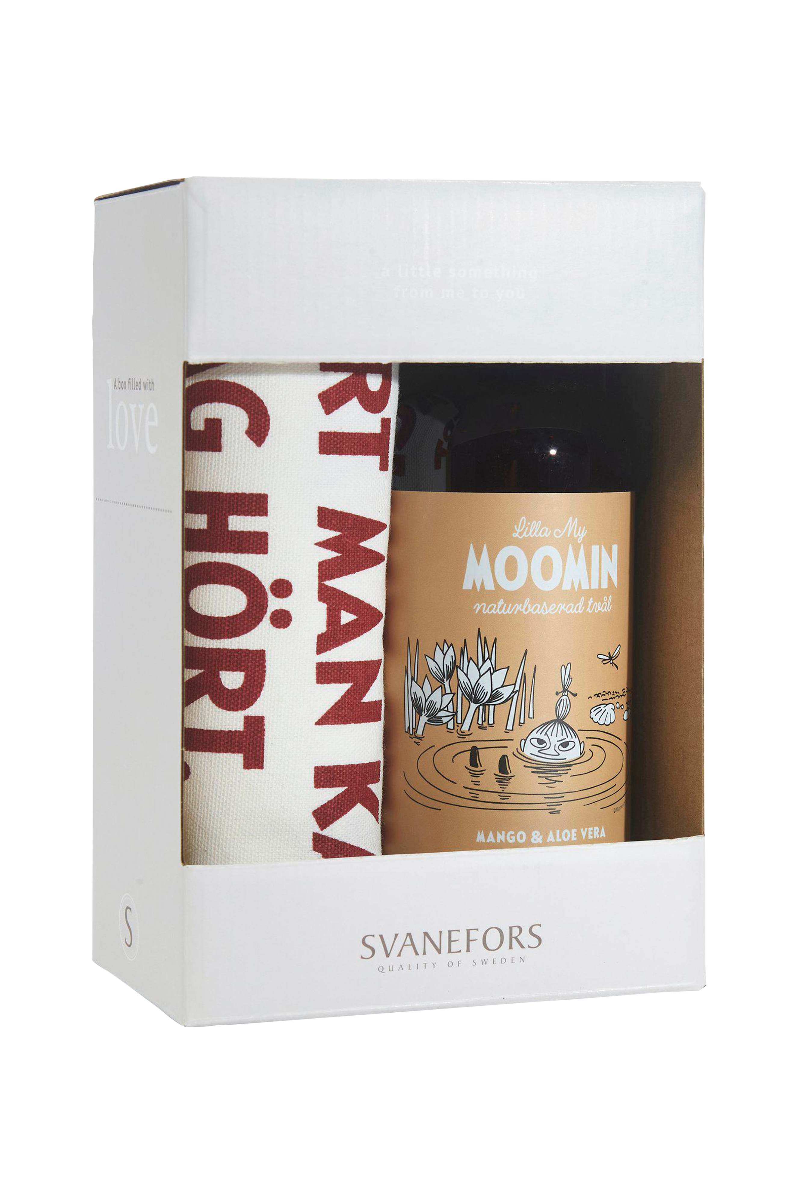 Saippua ja keittiöpyyhe kauniissa lahjapakkauksessa. Keittiöpyyhkeessä on sitaatti Muumimammalta Tove Janssonin kirjasta Näkymätön lapsi. Keittiöpyyhe 100% puuvillaa. Käsisaippua, joka sisältää kosteuttavaa mangoa ja aloe veraa. Sisältää iholle tärkeitä antioksidantteja, jotka säilyttävät kosteuden ja antavat iholle hohtoa. Pullon koko 500 ml.