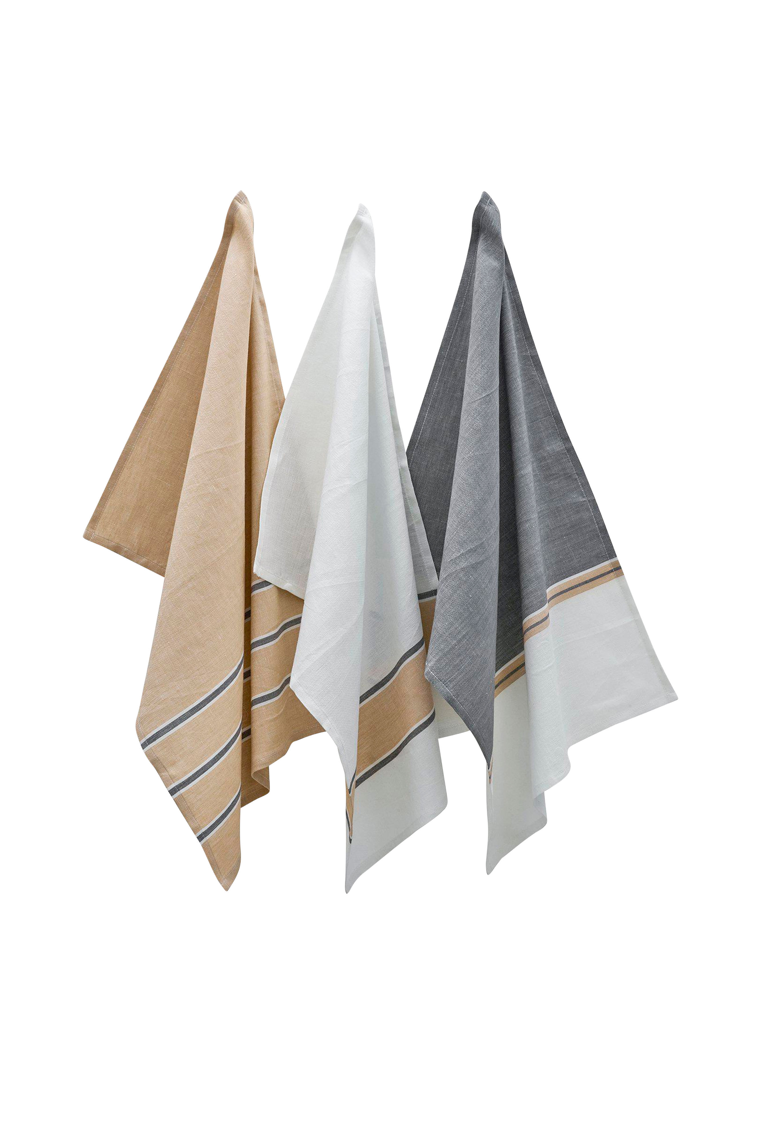 Keittiöpyyhkeet puolipellavaa, 3/pakk. Yhteensopivat raidat. Kevyt pesty efekti. Pellavalla on hyvä imukyky ja se ei nukkaa, minkä vuoksi se sopii hyvin keittiöpyyhkeiden materiaaliksi. Mitat 50x70cm. 50% pellavaa, 50% puuvillaa.