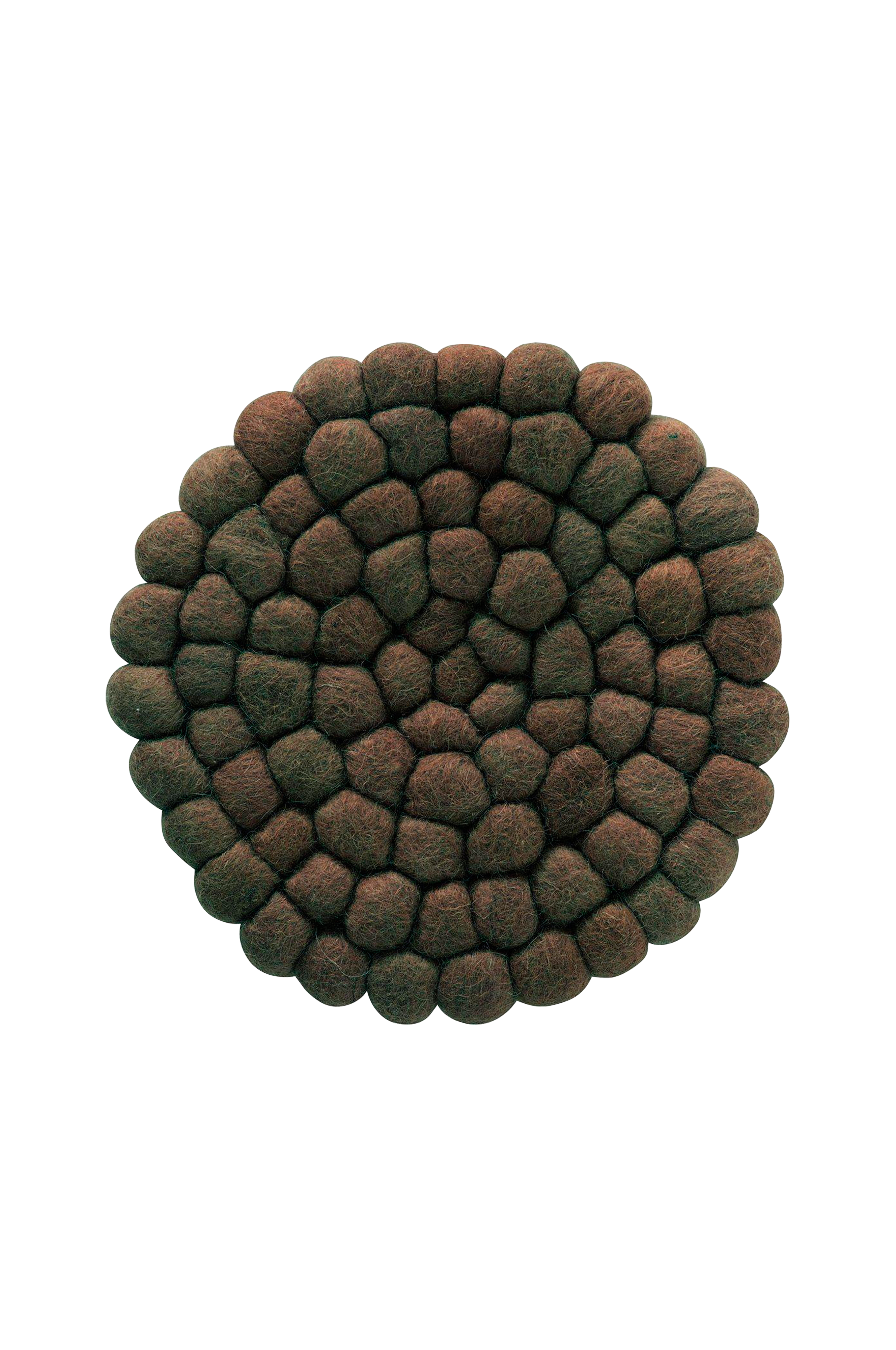 Huovutetuista villaisista palloista valmistettu pannunalunen tuo kodikasta ja koristeellista ilmettä pöytäkattaukseen. Mitat: Halkaisija 20 cm. 100% villaa.