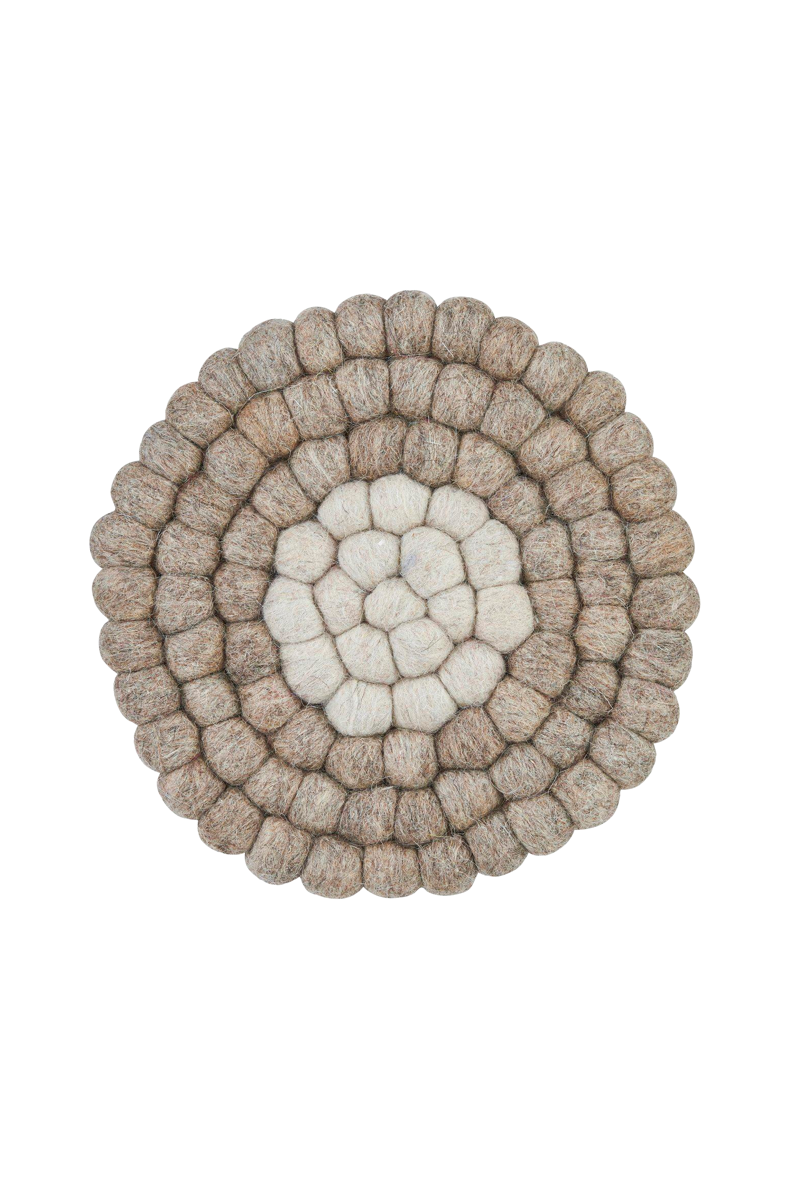 Huovutetuista villaisista palloista valmistettu pannunalunen tuo kodikasta ja koristeellista ilmettä pöytäkattaukseen. Mitat: Halkaisija 20 cm. 100% villaa.
