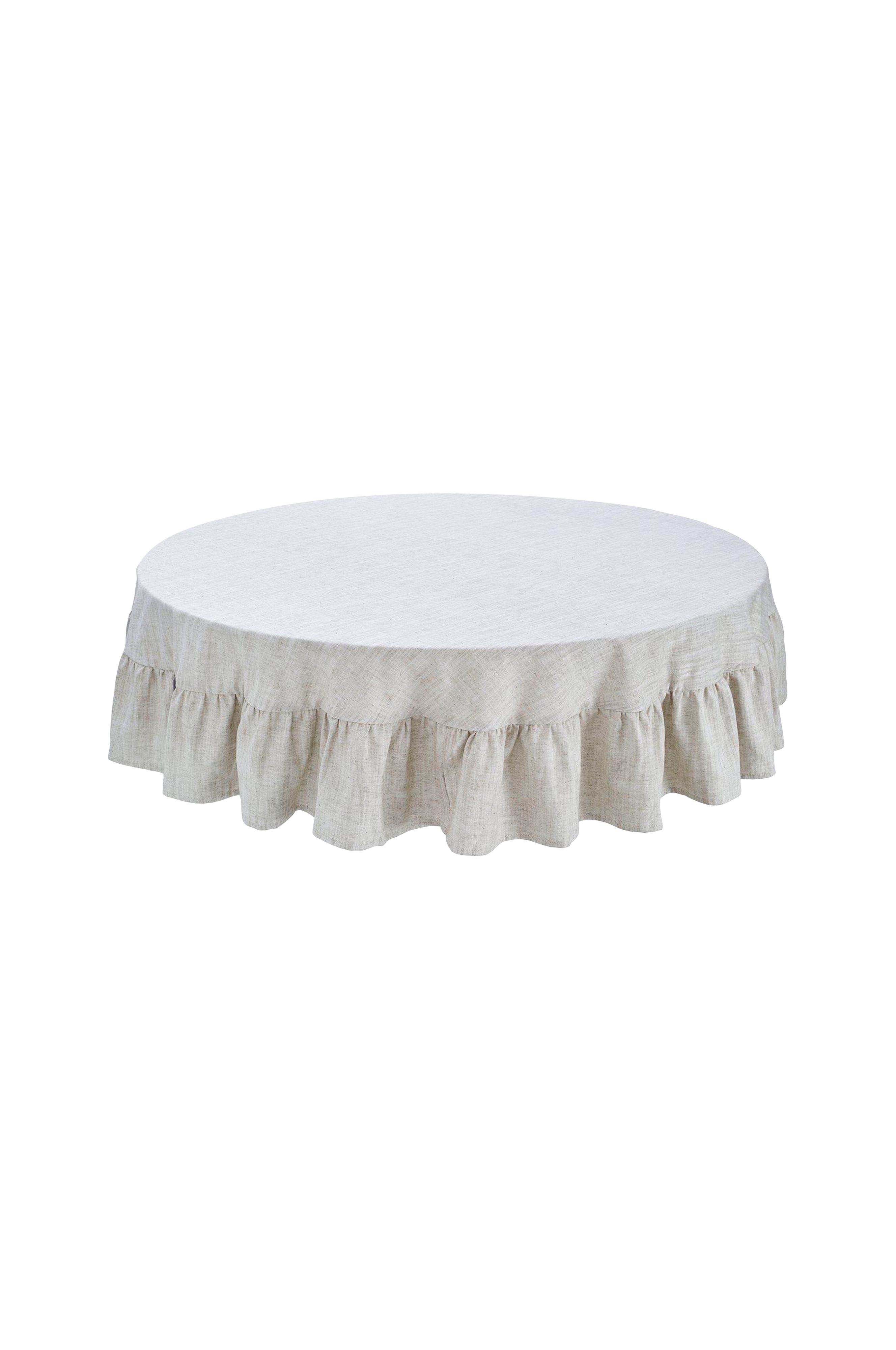 Pyöreä pöytäliina puuvilla-pellavasekoitetta. Kangas on kudottu chambray-tekniikalla, joka antaa kudokselle pellavamaisen ilmeen. Pöytäliinan halkaisija on 160 cm ja reunaa kiertävän röyhelön leveys 20 cm. Kata pöytään yhteensopivat kangaslautasliinat ja aseta pöytäliinan alle huopakangas saadaksesi erittäin ylellisen kattauksen. Tuote on standard 100 by oeko-tex® -sertifioitu. Sertifiointi takaa, että tuote on testattu eikä sisällä terveydelle ja ympäristölle haitallisia aineita. 90% puuvillaa, 10% pellavaa.