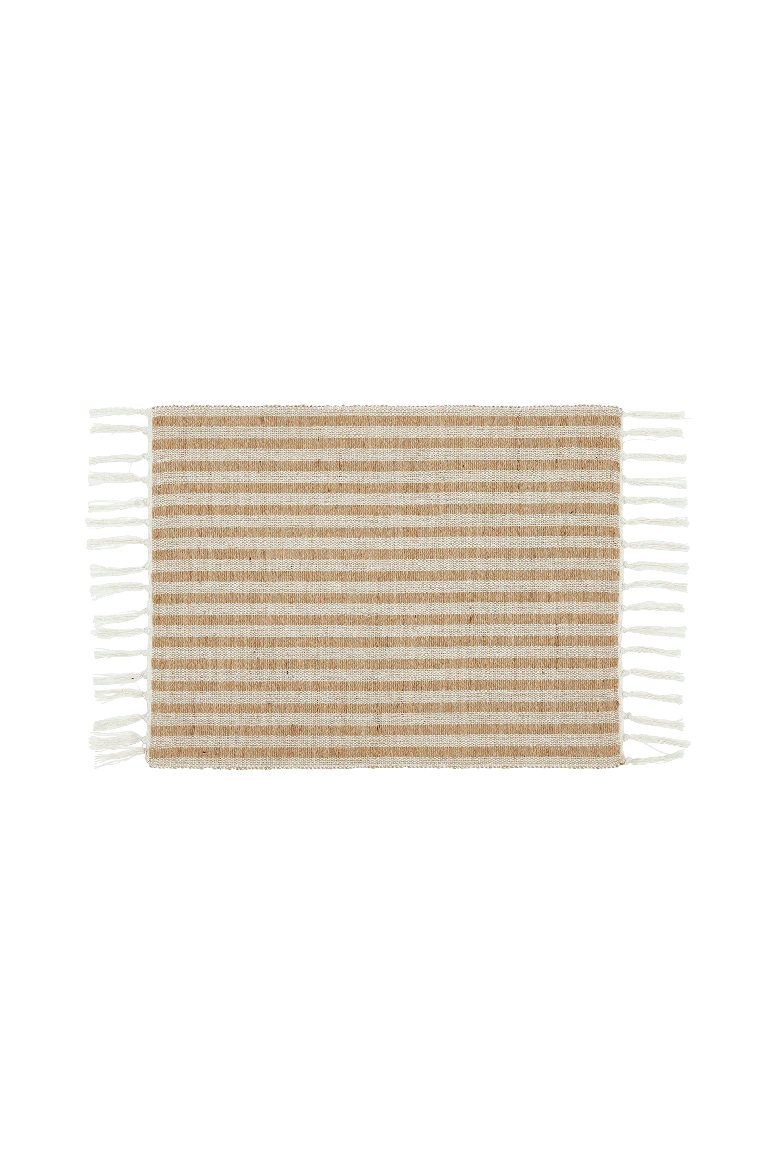 Raidallinen pöytätabletti puuvillaa/juuttia. Hapsut. Koko 33x45 cm ilman hapsuja. Tuote on standard 100 by oeko-tex® -sertifioitu. Sertifiointi takaa, että tuote on testattu eikä sisällä terveydelle ja ympäristölle haitallisia aineita. 50% juuttia, 50% puuvillaa.
