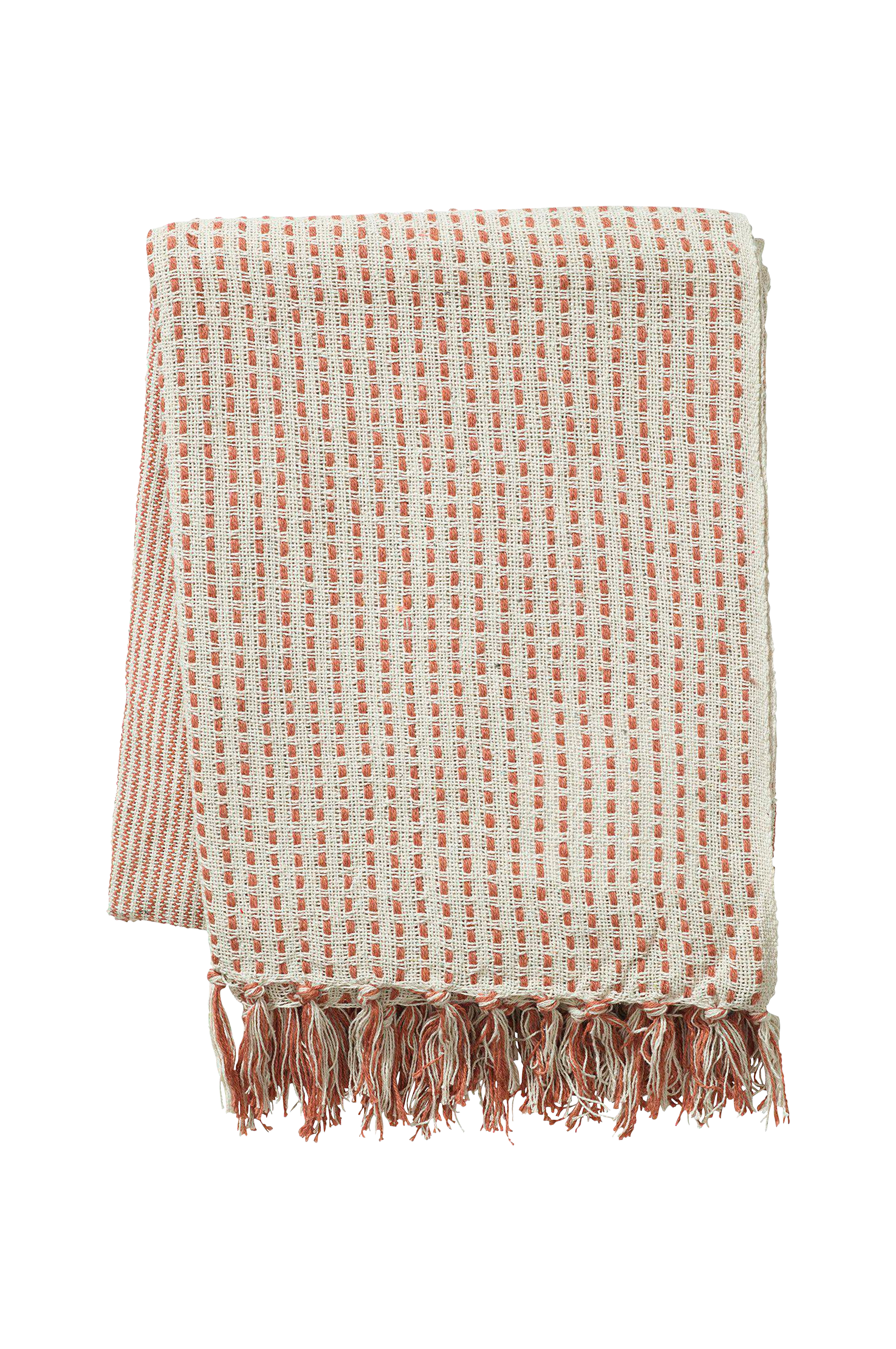Puuvillapeitto, jossa kudottu kuvio ja hapsut lyhyillä sivuilla. Koko 125x150 cm. 100% puuvillaa.