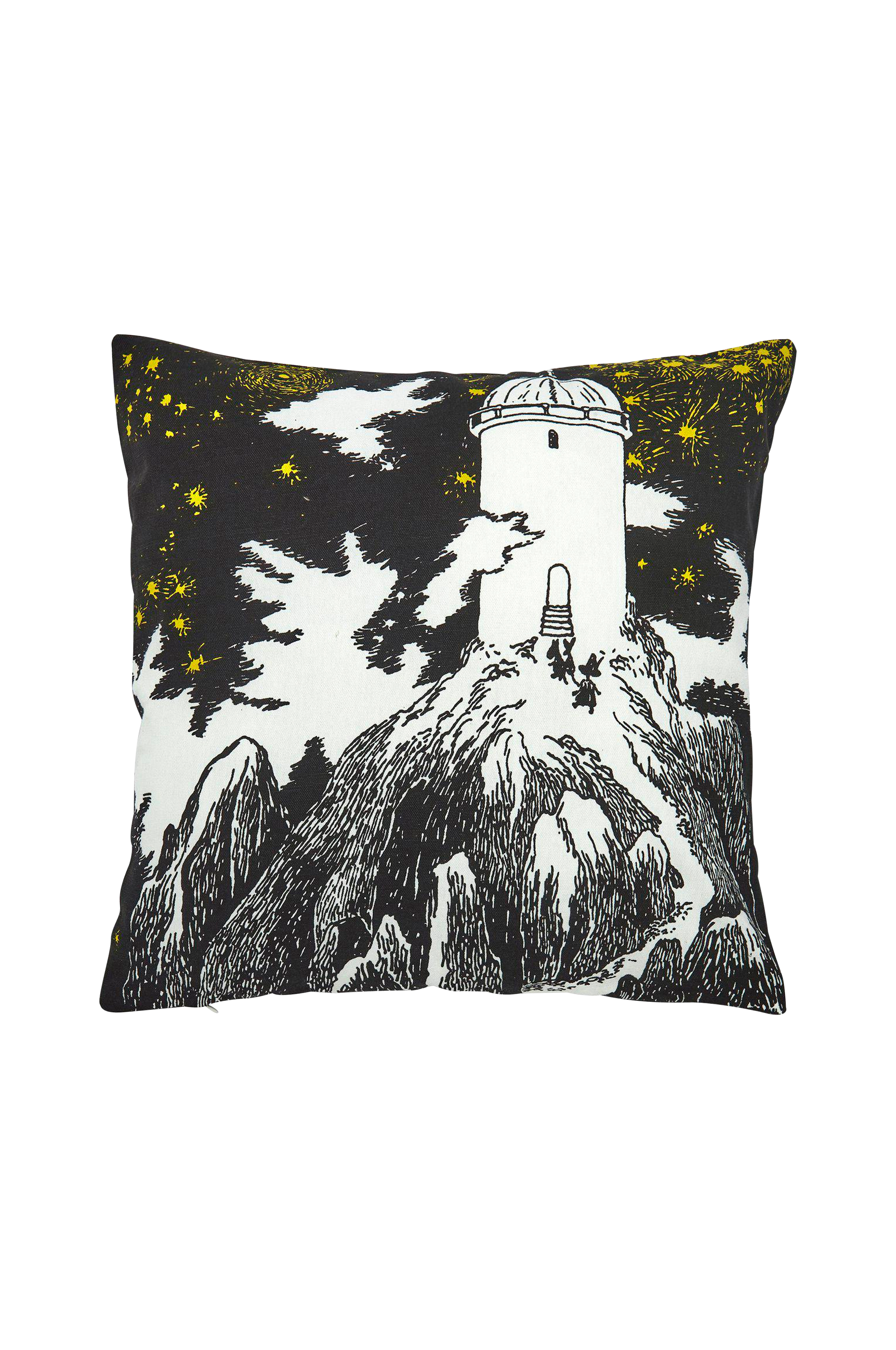 "Pyrstötähti on yksinäinen tähti, joka on pillastunut ja ryntäilee pitkin avaruutta hehkuva häntä perässään". Puuvillainen tyynynpäällinen, jossa on painatus Tove Janssonin kirjasta Muumipeikko ja pyrstötähti. Vetoketju alareunassa. Sisätyyny myydään erikseen. 100% puuvillaa.
