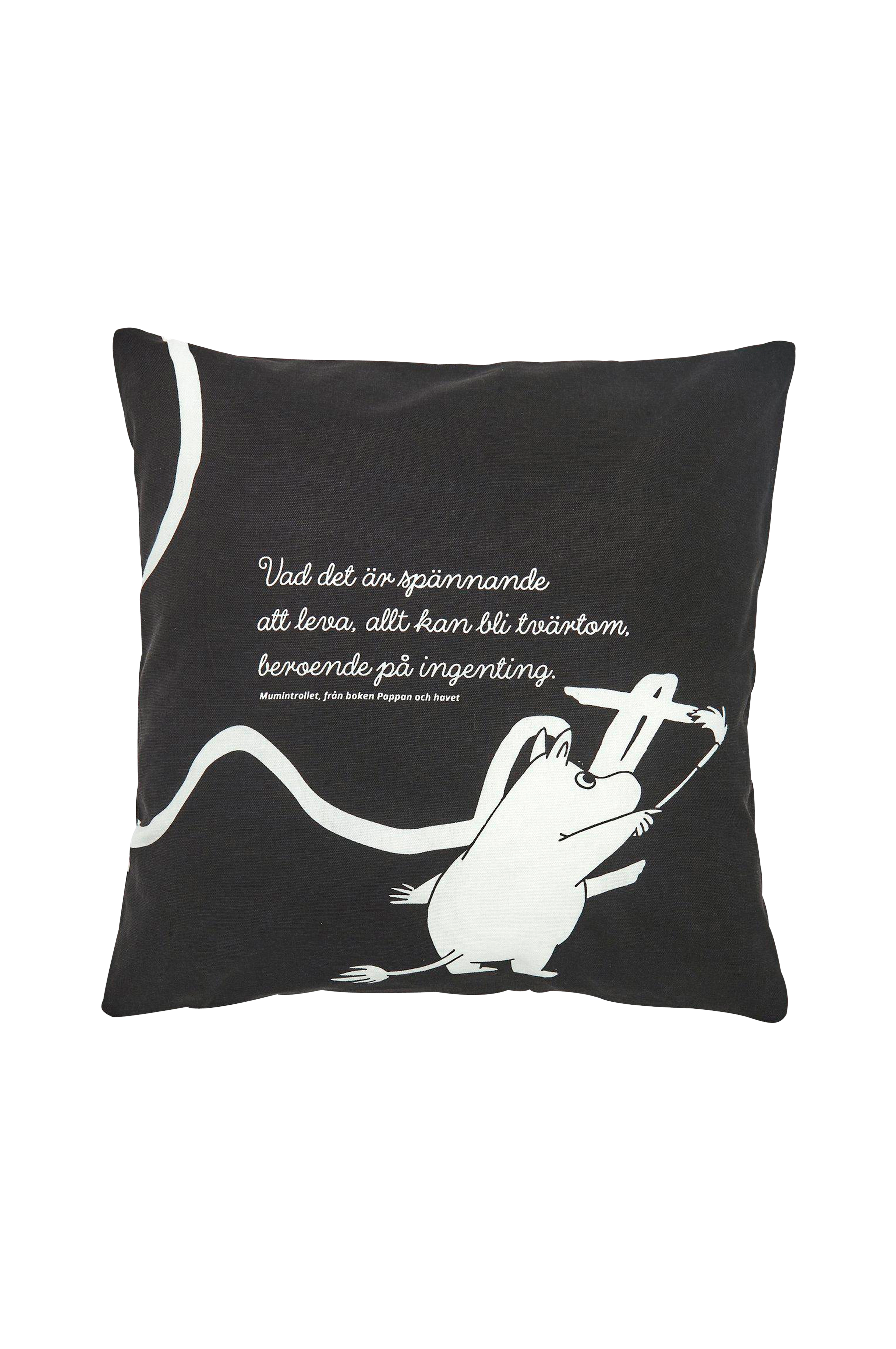 "Kyllä on jännittävää elää, kaikki voi hetkessä kääntyä ihan ylösalaisin ilman mitään syytä". Puuvillainen tyynynpäällinen, johon on painettu lainaus Tove Janssonin kirjasta Muumipappa ja meri. Sisätyyny myydään erikseen. 100% puuvillaa.