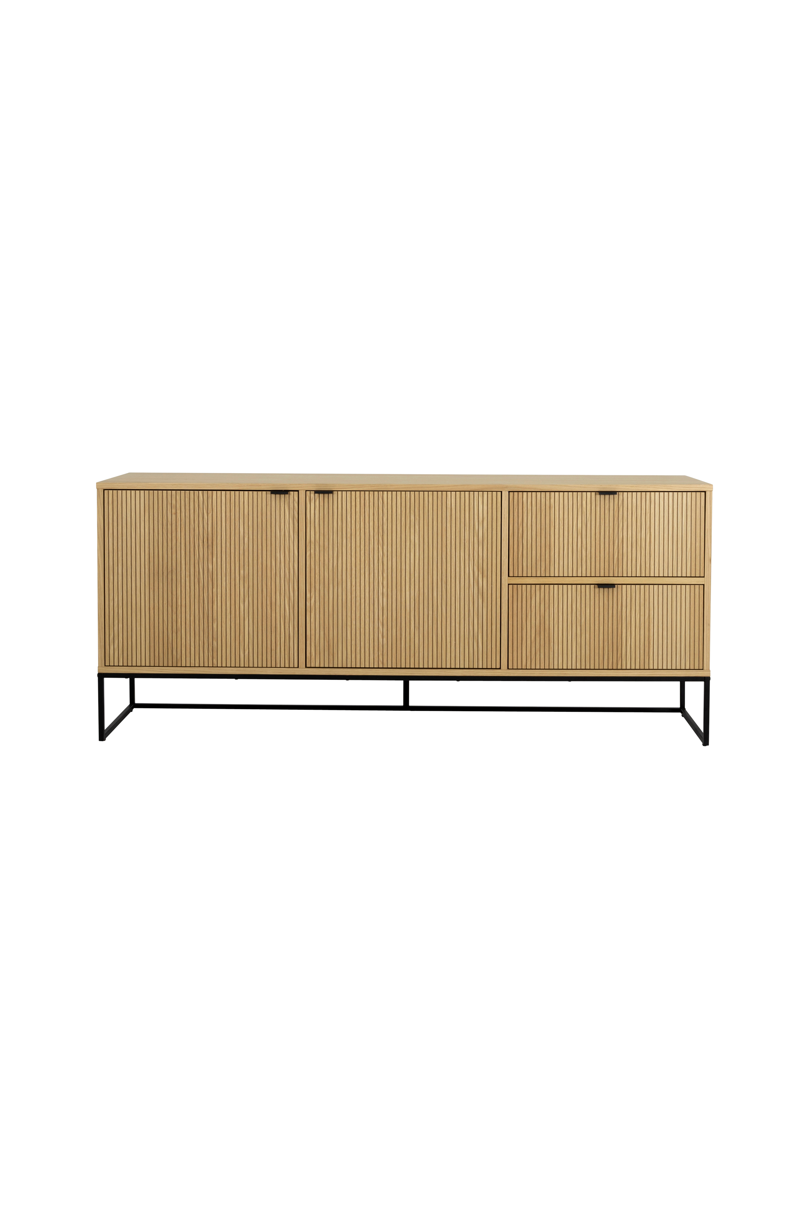 Uurretut ovet ja laatikot tyylikkäillä metallikahvoilla antavat huonekalulle aavistuksen eleganssia. Vakaassa metallijalustassa on moderni muotoilu. Tämä moderni huonekalu on osa Bali-mallistoa ja helppo yhdistää muihin huonekaluihin, joissa on sama moderni ulkonäkö.