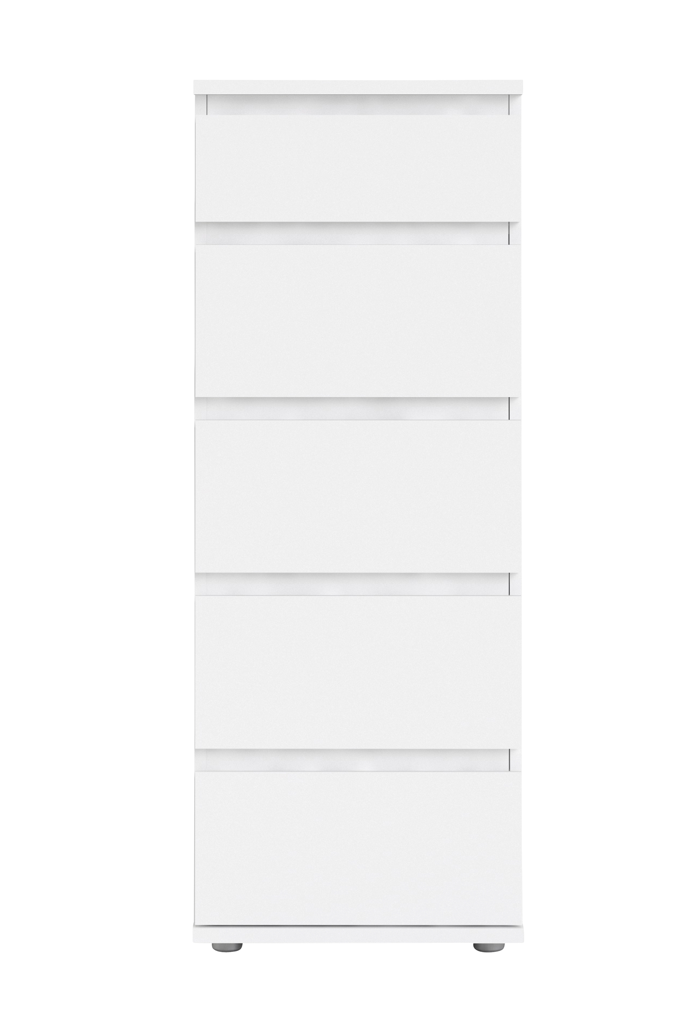 Tvilumin viisilaatikkoinen lipasto sopii kaikenlaisiin huoneisiin ja on erinomainen ratkaisu pieneen tilaan. Ajattoman minimalistinen muotoilu sulautuu vaivatta monenlaisiin sisustustyyleihin. Viidessä vetimettömässä laatikossa on runsaasti säilytystilaa, mutta itse lipasto ei vie paljon tilaa, joten se on käytännöllinen kaluste makuuhuoneeseen. Kalvopinta on haalistumaton ja helppo puhdistaa, ja se tuo muotoiluun selkeälinjaista, pehmeäreunaista ilmettä. Valmistettu Tanskassa.