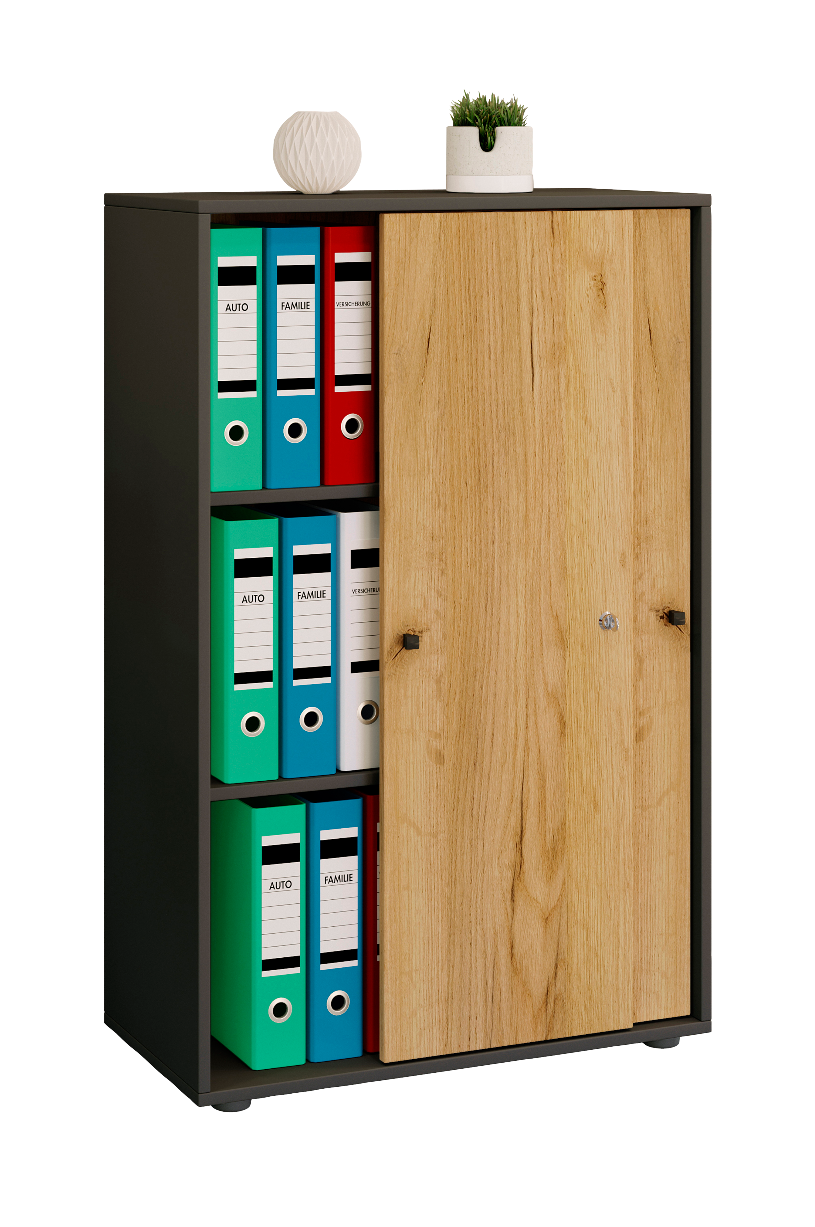 lukittavilla liukuovilla varustetussa toimistokaapissa "lona xl " on kaksi hyllyä ja tilaa 21 kansiolle ja muille välineille. Runko on valmistettu puukuviojäljitelmästä ja siinä on tukeva takapaneeli.