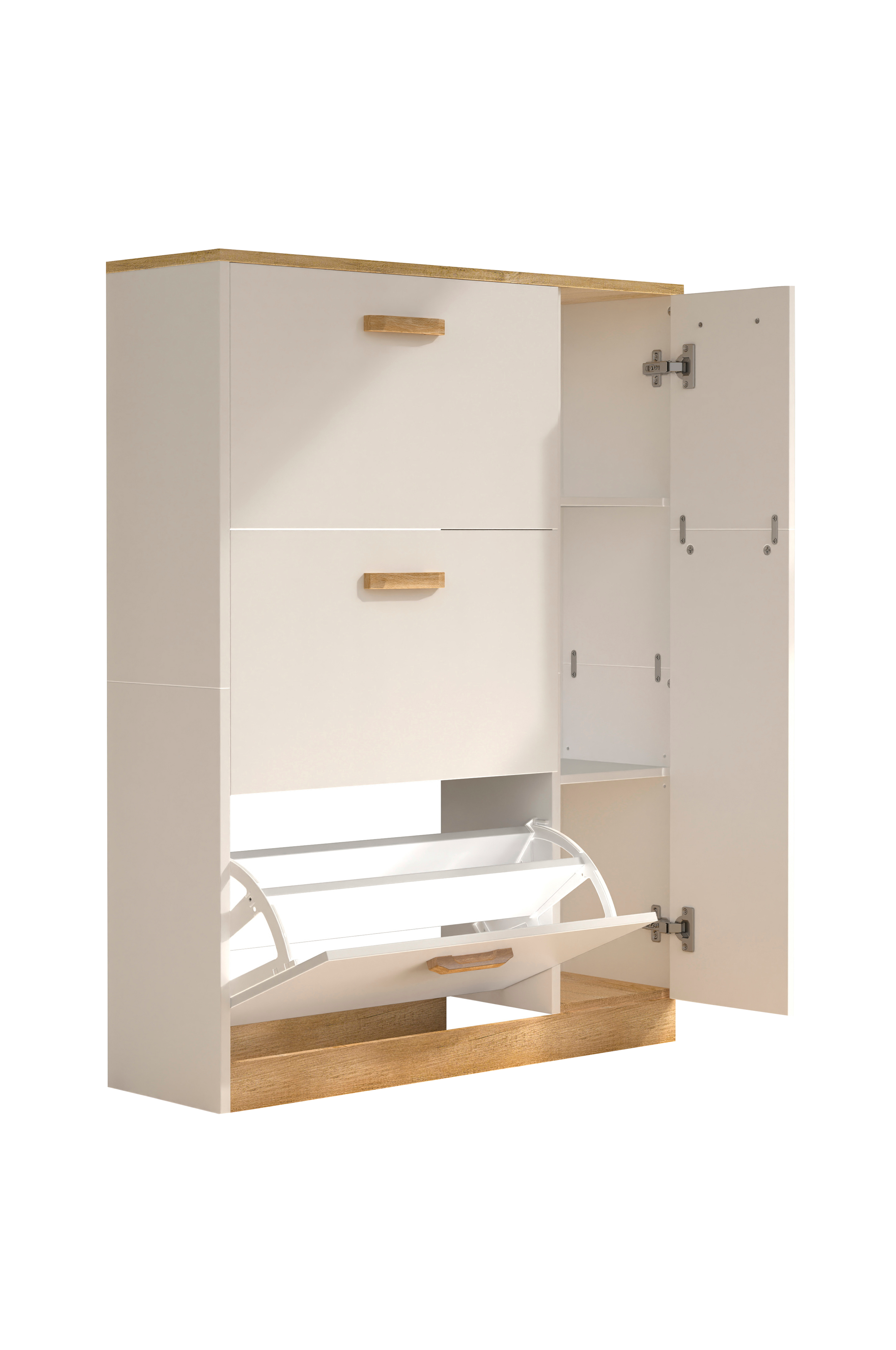 "halom" kenkäkaappi on pienen tilan ihme, jossa on runsaasti säilytystilaa. Jokaisessa kolmessa saranoidussa lokerossa on lokeronjakaja, joten kengät voidaan sijoittaa siististi ja tilaa säästävästi. Saranoidun oven takana on lisää säilytystilaa kengille tai vaatteille. Suunnittelija on luonut erityisen kohokohdan värikoristeilla, jotka korostavat tyylikkäästi kahvoja ja tekevät kenkäkaapista ajattoman katseenvangitsijan.