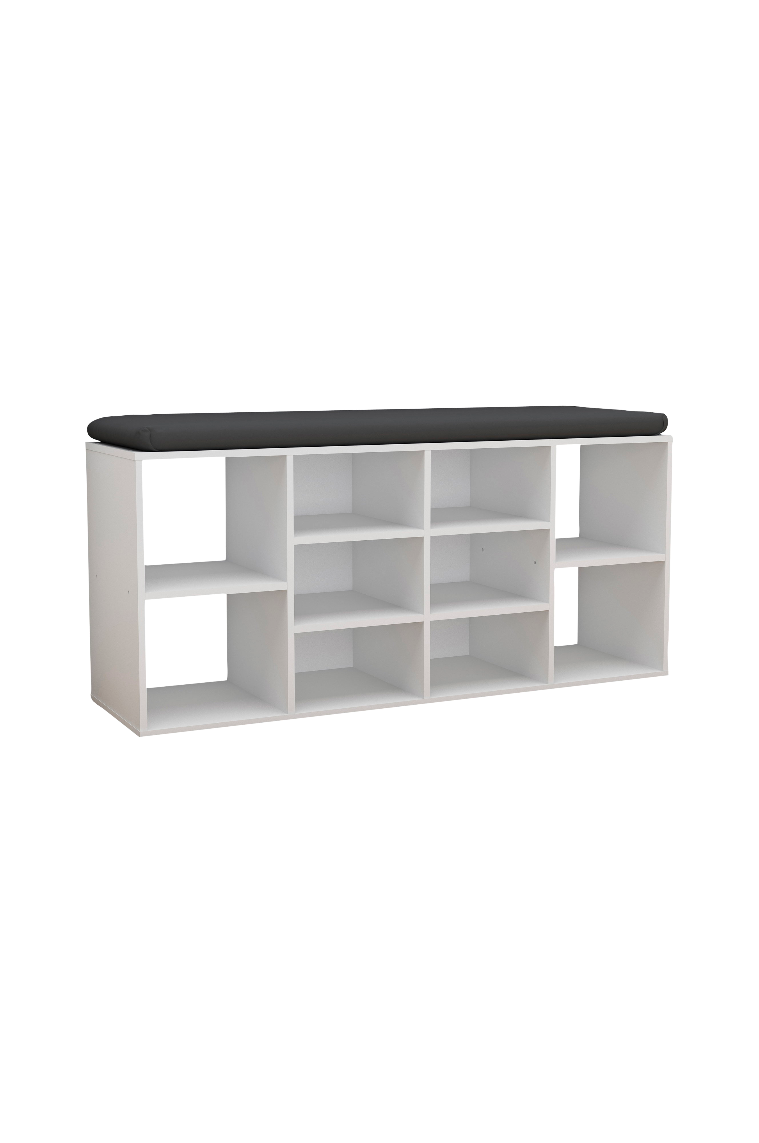 Kymmenessä lokerossa on tilaa kymmenelle kenkäparille tai muille tarvikkeille. Samalla eteiskaluste tarjoaa käytännöllisen istumapaikan.