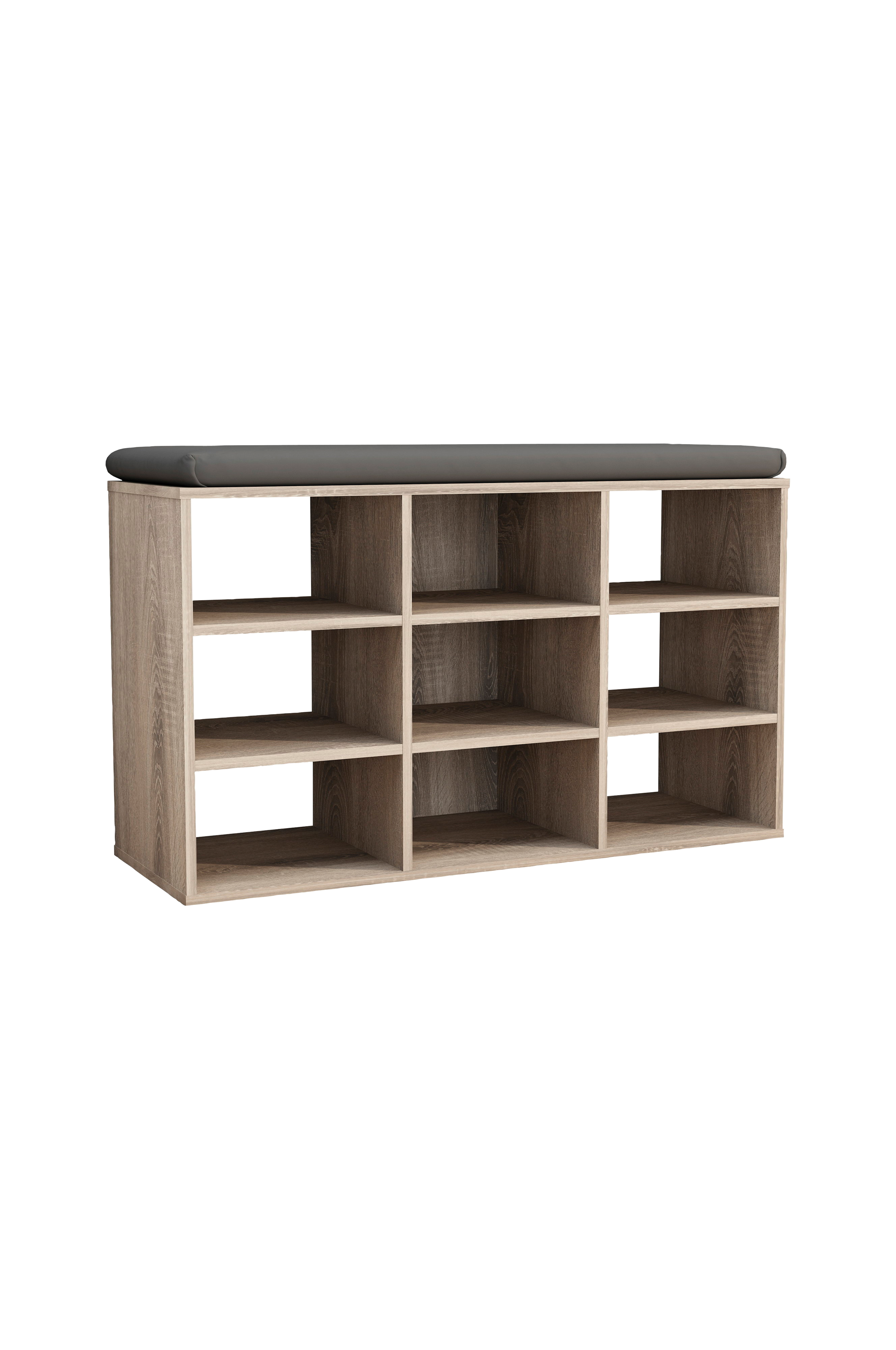 Yhdeksässä lokerossa on riittävästi tilaa yhdeksälle kenkäparille tai muille tarvikkeille. Samalla eteiskaluste tarjoaa käytännöllisen istumapaikan.