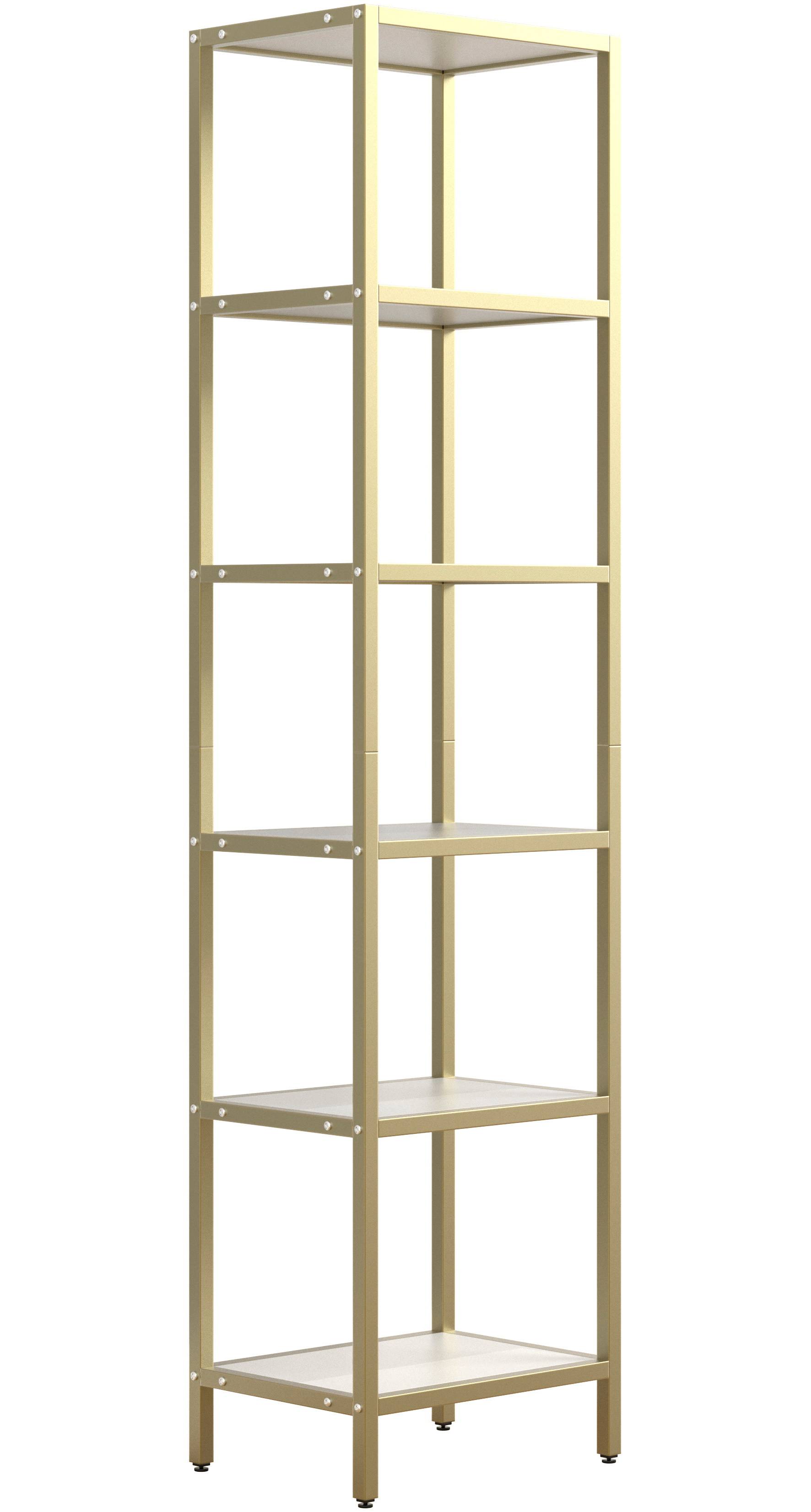 Rautakehikon teollinen ilme täydentyy maalaismaisella puulla, mikä luo harmonisen tyylisekoituksen. Upea seisova hylly, jossa on viisi avointa lokeroa ja joka tarjoaa monia käytännöllisiä käyttötarkoituksia.