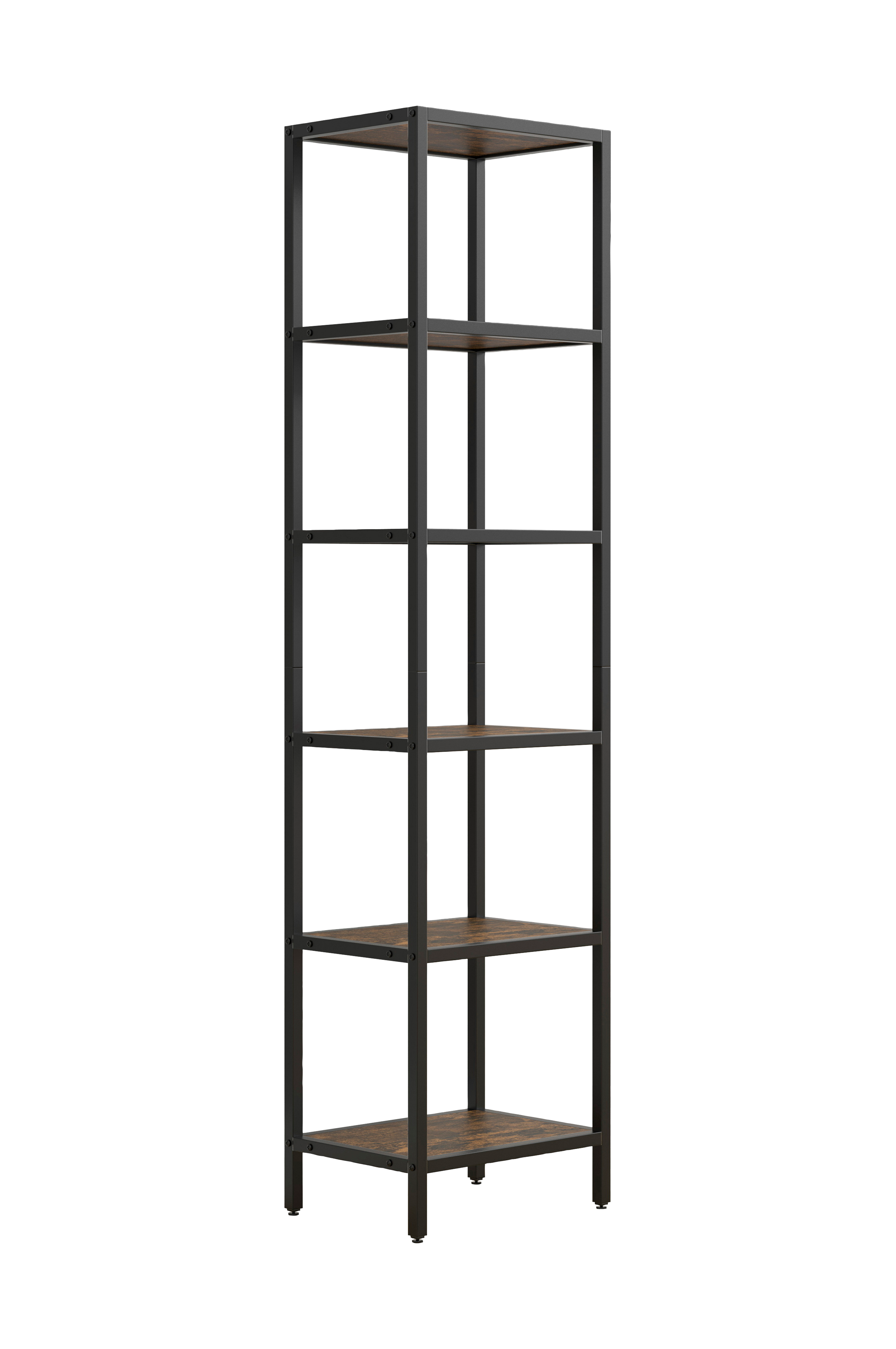 Rautakehikon teollinen ilme täydentyy maalaismaisella puulla, mikä luo harmonisen tyylisekoituksen. Upea seisova hylly, jossa on viisi avointa lokeroa ja joka tarjoaa monia käytännöllisiä käyttötarkoituksia.
