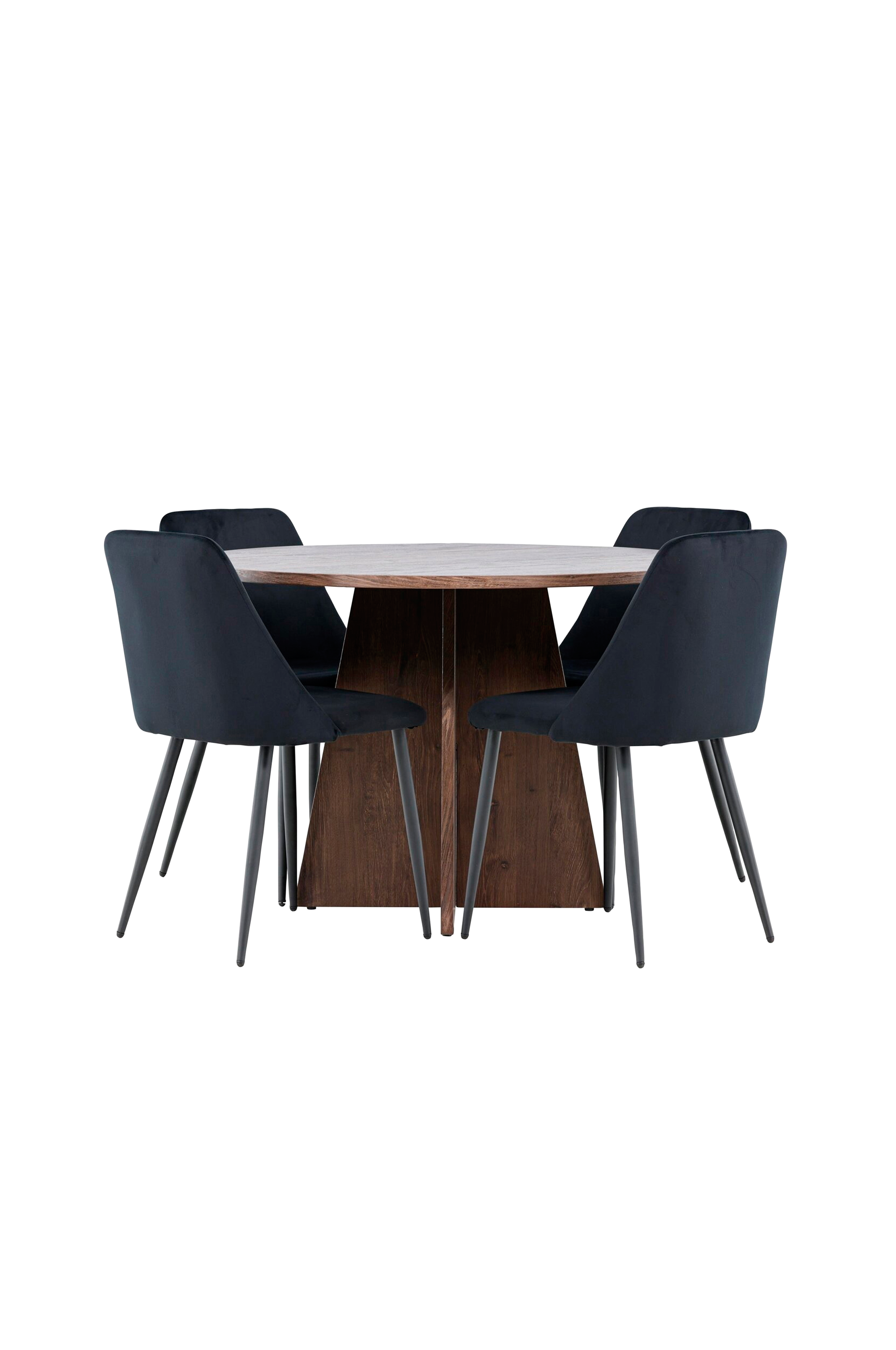 Muunna ruokailutilasi tyylikkäällä ruokailusarjalla, jossa yhdistyvät tyylikäs bootcut-pöytä ja ylelliset yötuolit. Tämä ruokailusetti sopii erinomaisesti sekä jokapäiväisiin aterioihin että juhlallisiin tilaisuuksiin ja antaa ruokasalillesi hienostuneen ja kutsuvan tunnelman. Bootcut-pöytä on valmistettu mdf-levystä, ja halkaisijaltaan 110 cm:n pöytä tarjoaa runsaasti tilaa ruoalle ja keskustelulle, ja sen pyöreä muoto luo ruokasaliisi harmonisen ja tasapainoisen ilmapiirin. Tukeva rakenne takaa pitkäaikaisen käytön ja vakauden. Neljä yötuolia täydentävät pöytää täydellisesti tyylikkäillä samettiistuimillaan. Tuolit tarjoavat sekä mukavuutta että tyyliä, joten ne sopivat erinomaisesti pitkiin, rentouttaviin illallisiin perheen ja ystävien kanssa. Niiden moderni muotoilu korkeilla selkänojilla ja pehmeillä istuimilla tuo ruokasaliin hienostuneen lisän. Tämä ruokailusetti on täydellinen yhdistelmä estetiikkaa ja toiminnallisuutta, joten se on erinomainen valinta niille, jotka haluavat tyylikkään ja mukavan ruokailutilan. Päivitä ruokasalisi bootcut-pöydän ja yötuolien tyylikkäällä yhdistelmällä ja luo paikka, jossa muistot ja ilo jaetaan.