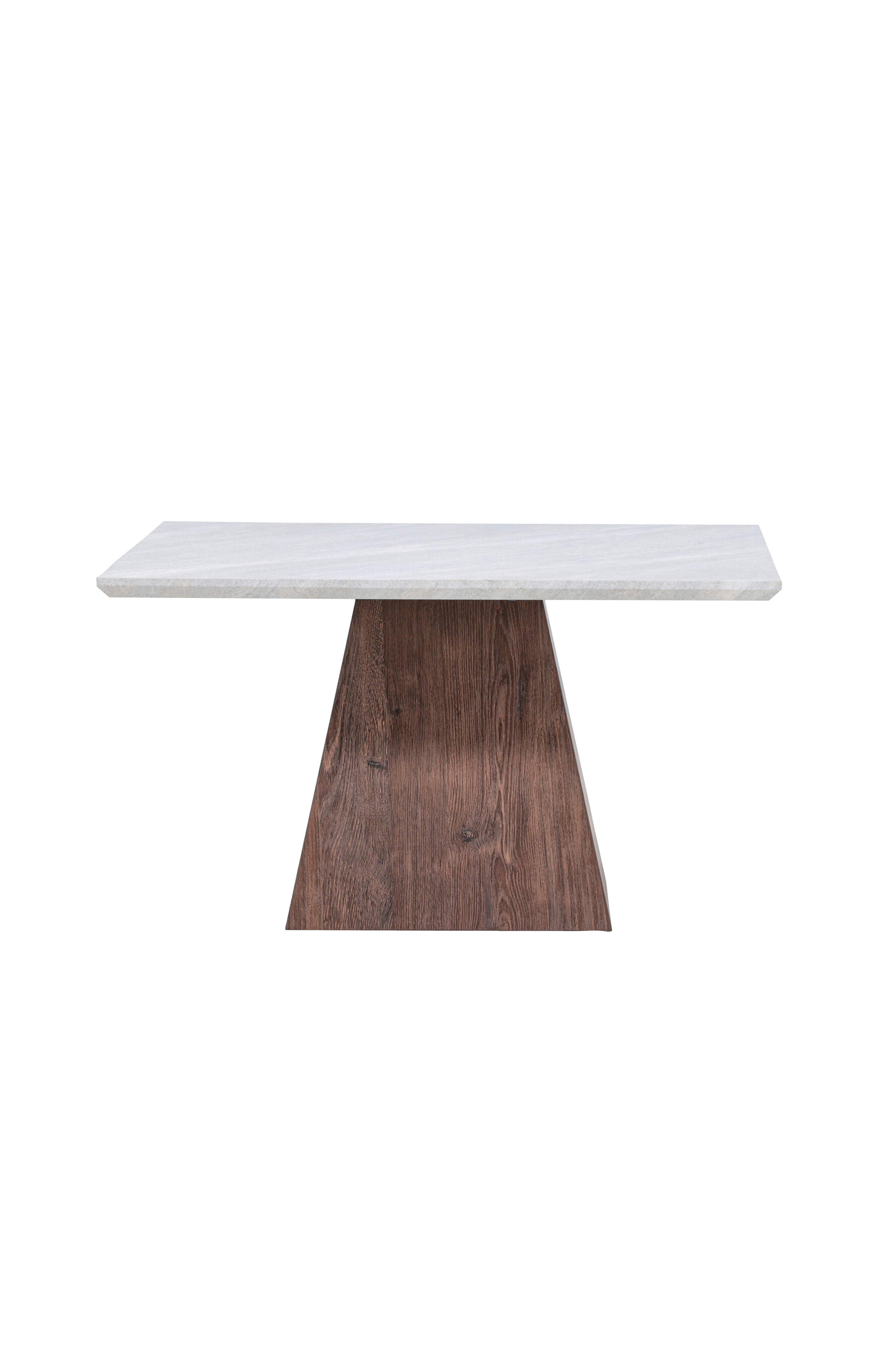 Tässä neliön muotoisessa sohvapöydässä yhdistyvät tyylikkyys ja trendikäs muotoilu. Vaalea marmorin näköinen pöytälevy tarjoaa eksklusiivisen ja ajattoman ilmeen, kun taas keskellä oleva mokkanvärinen jalka luo lämpimän kontrastin, joka antaa pöydälle luonnetta. Vakaa jalusta antaa pöydän ympärille ilmavan tunnelman ja tarjoaa samalla vankan tuen - sekä käytännöllinen että tyylikäs. Vaaleiden ja tummien sävyjen sekoitus tekee tästä pöydästä yhtä hyvin sopivan minimalistisiin kuin sisustetumpiinkin olohuoneisiin.