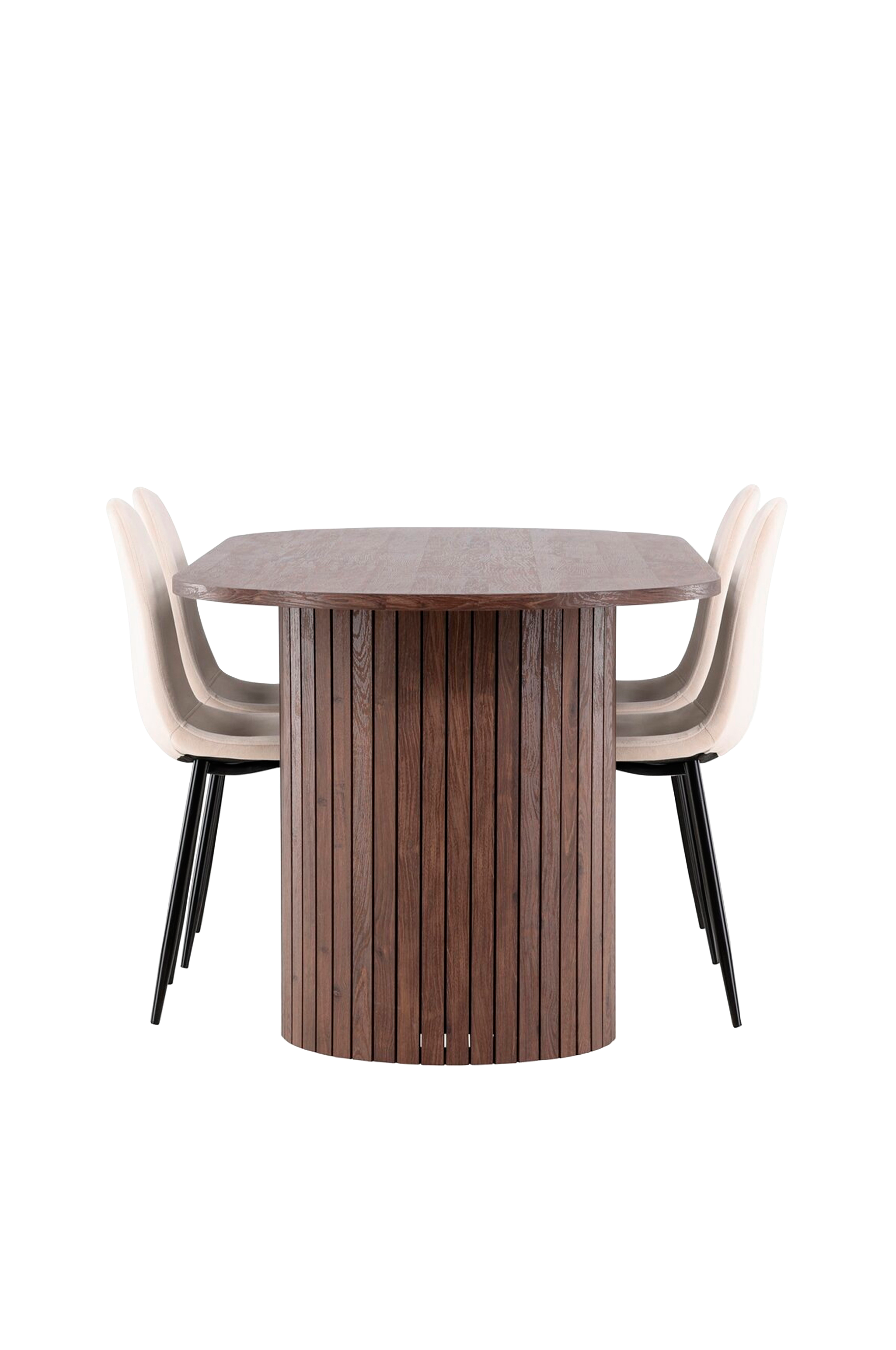 Löydä täydellinen ruokailusetti, jossa on polar-ruokailutuolit ja härön-ruokapöytä - yhdistelmä modernia eleganssia ja toimivuutta kotiisi. Polar-ruokailutuolit ovat moderni unelma. Näissä tuoleissa on täysin verhoiltu muotoilu, jossa on hieman pyöristetty selkänoja ja istuinosa samettikangasta, sekä jalat pulverimaalattua metallia. Ne ovat yhtä mukavia kuin silmiä hiveleviä ja luovat kutsuvan tunnelman ruokasaliisi. Vaatii kevyen kokoonpanon. Hoito-ohjeet: käytä tekstiilisuihketta kankaan kyllästämiseen ennen käyttöä, jolloin lika ja tahrat on helpompi poistaa. Poista tahrat välittömästi pyyhkimällä ne varovasti liinalla. Käytä sitkeämpiin tahroihin tahranpoistoainetta, joka on testattu ensin vähemmän näkyvällä kankaan osalla. Täydennä Härön ruokapöydällä, jossa yhteisöllisyys kukoistaa ja muistot syntyvät. Runsaan 200x90 cm:n kokoinen pöytä tarjoaa runsaasti tilaa sekä perheen että ystävien kokoamiseen miellyttäviä illallisia ja pitkiä keskusteluja varten. Härön-ruokapöydässä on tyylikäs viimeistely, joka antaa huoneellesi maanläheisen ja neutraalin tunnelman. Pöytälevy on valmistettu mdf-levystä, ja se on tuettu tukevilla teräsjaloilla, jotka takaavat vakauden kaikkien aterioiden ja kokoontumisten aikana. Luo ystävyyden ja yhteenkuuluvuuden ilmapiiri tällä ruokailusarjalla, jossa jokaisesta ateriasta tulee erityinen hetki, jonka muistat. Olipa kyse sitten jokapäiväisistä aterioista tai juhlallisista tilaisuuksista, Polar-ruokailutuoleista ja Härön-ruokapöydästä tulee kotisi sydän, jossa suhteet vahvistuvat ja ilo jaetaan.