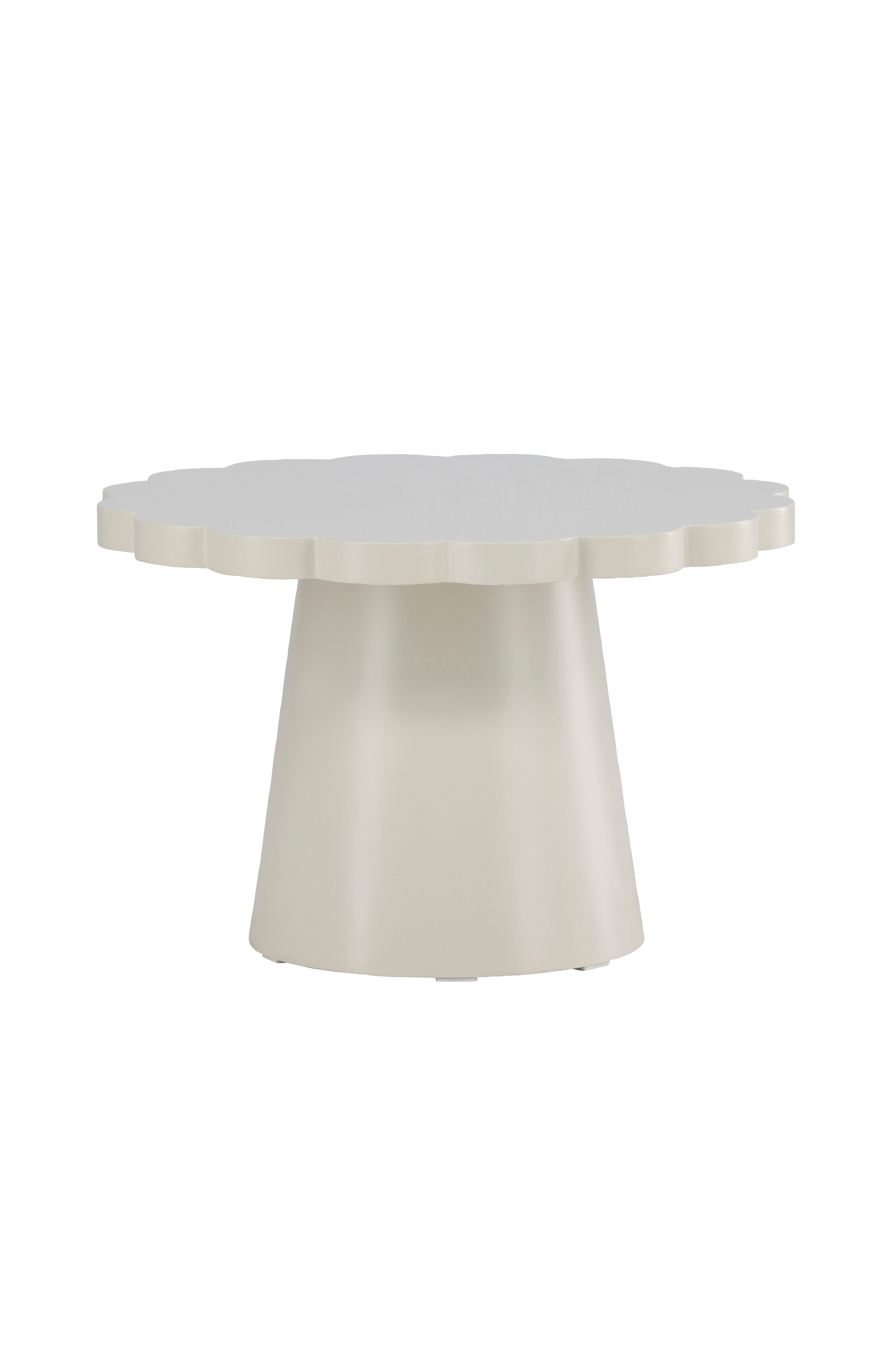 pöytälevyssä on koristeellinen aaltoreuna, joka tuo leikkisän vivahteen muuten puhtaaseen muotoiluun. Sylinterimäinen jalka antaa pöydälle vakaan ja modernin luonteen, ja beigen värin ansiosta se sopii helposti erilaisiin sisustustyyleihin.