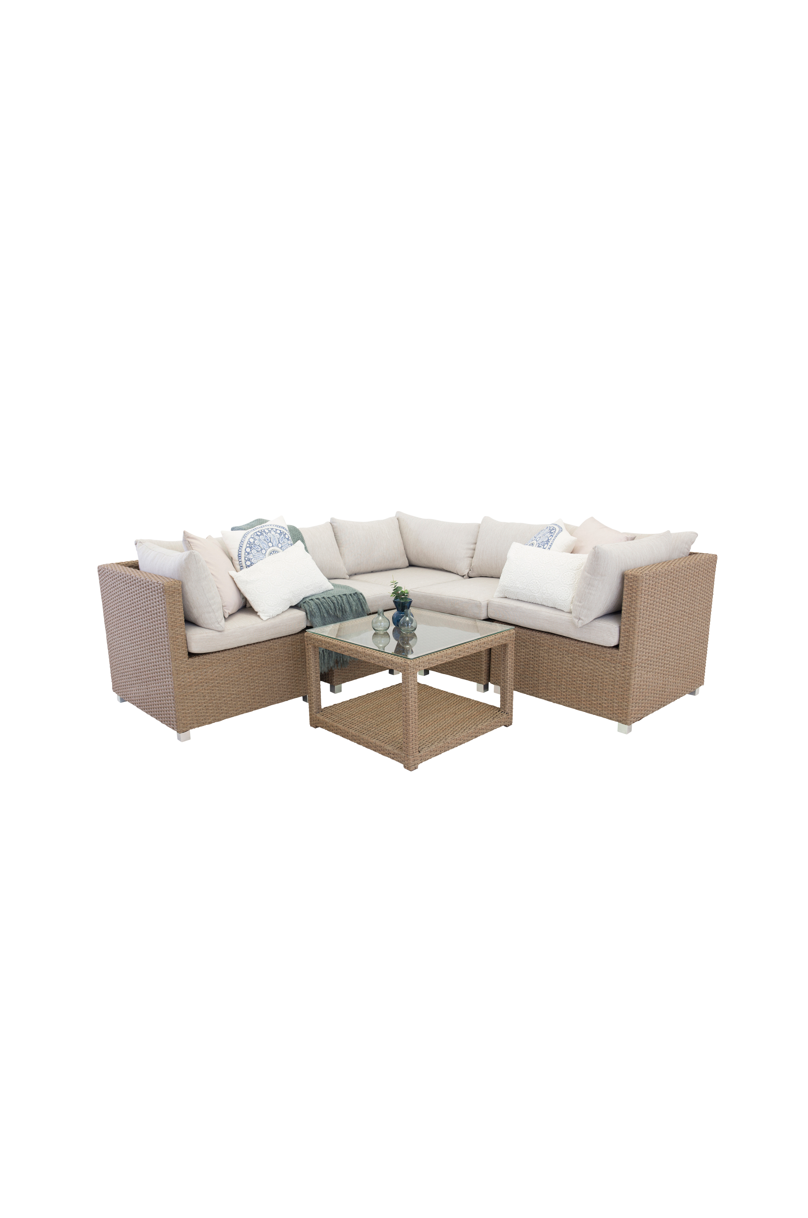 Vamos-oleskeluryhmä tekee vaikutuksen ylellisellä, rennolla muotoilullaan ja suorilla pohjoismaisilla muodoillaan. Modernisti muotoillussa sohvaryhmässä keskeistä on ulkotilan tai terassin mukavuus. Sohvaryhmä sisältää neljän istumapaikan kulmasohvan ja kulmaosan. Mukana pehmeät pehmusteet ja matalahko sohvapöytä, jossa on säilytyshylly ja tyylikäs lasinen pöytälevy. Oleskeluryhmässä on metallirunko ja värillistä polyrottinkia. Moduulit ovat ostettavissa erikseen. Valmistaudu ihanaan kesään ja pihaelämään!