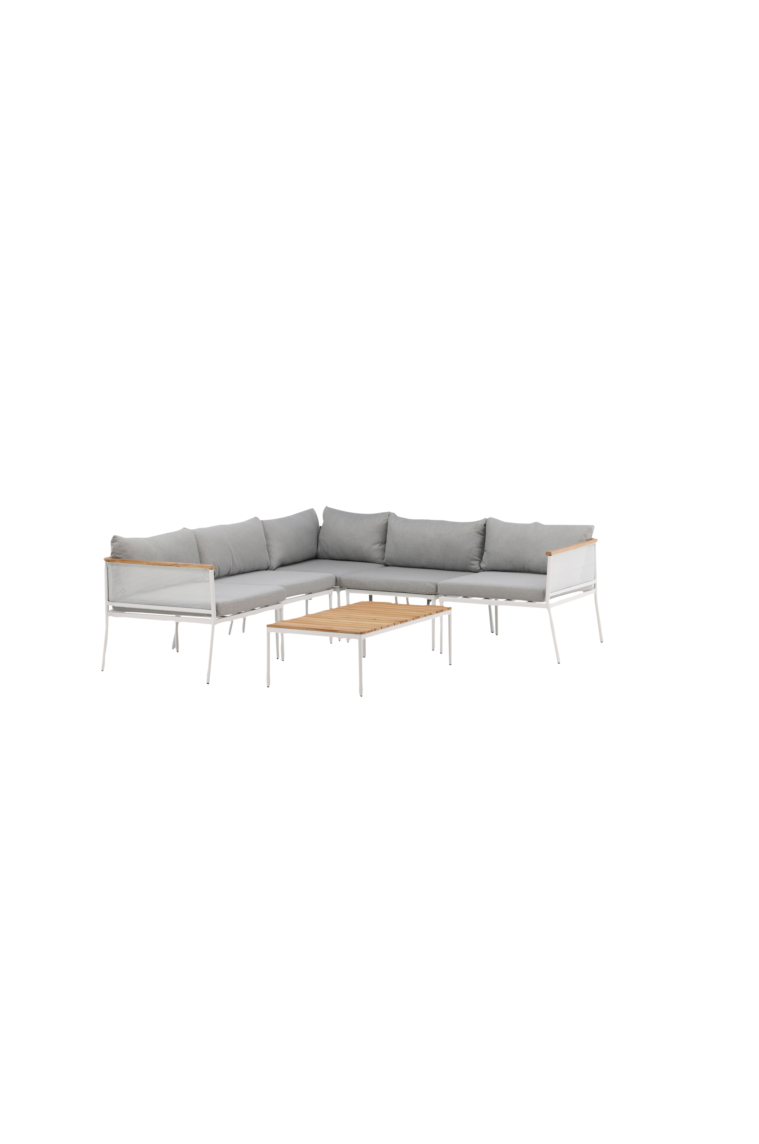 Nettan - täydellinen moderni ja tyylikäs sohvaryhmä ulkotilaan tai terassille! Moduuleista koostuvan sohvaryhmän voi sijoittaa monin eri tavoin omien toiveiden mukaan. Sohvassa on kolme istumapaikkaa ja yksi kulmapala. Sohva on valmistettu valkoisesta jauhemaalatusta metallista, ja yksityiskohdat ovat valkoista metalliverkkoa ja tiikkiä. Mukana pehmeät harmaat pehmusteet sekä suorakaiteenmuotoinen sohvapöytä, jossa pöytälevy tiikkiä. Helppo koota. Täällä on mukava istua ystävien ja sukulaisten kanssa myöhäisinä kesäiltoina!