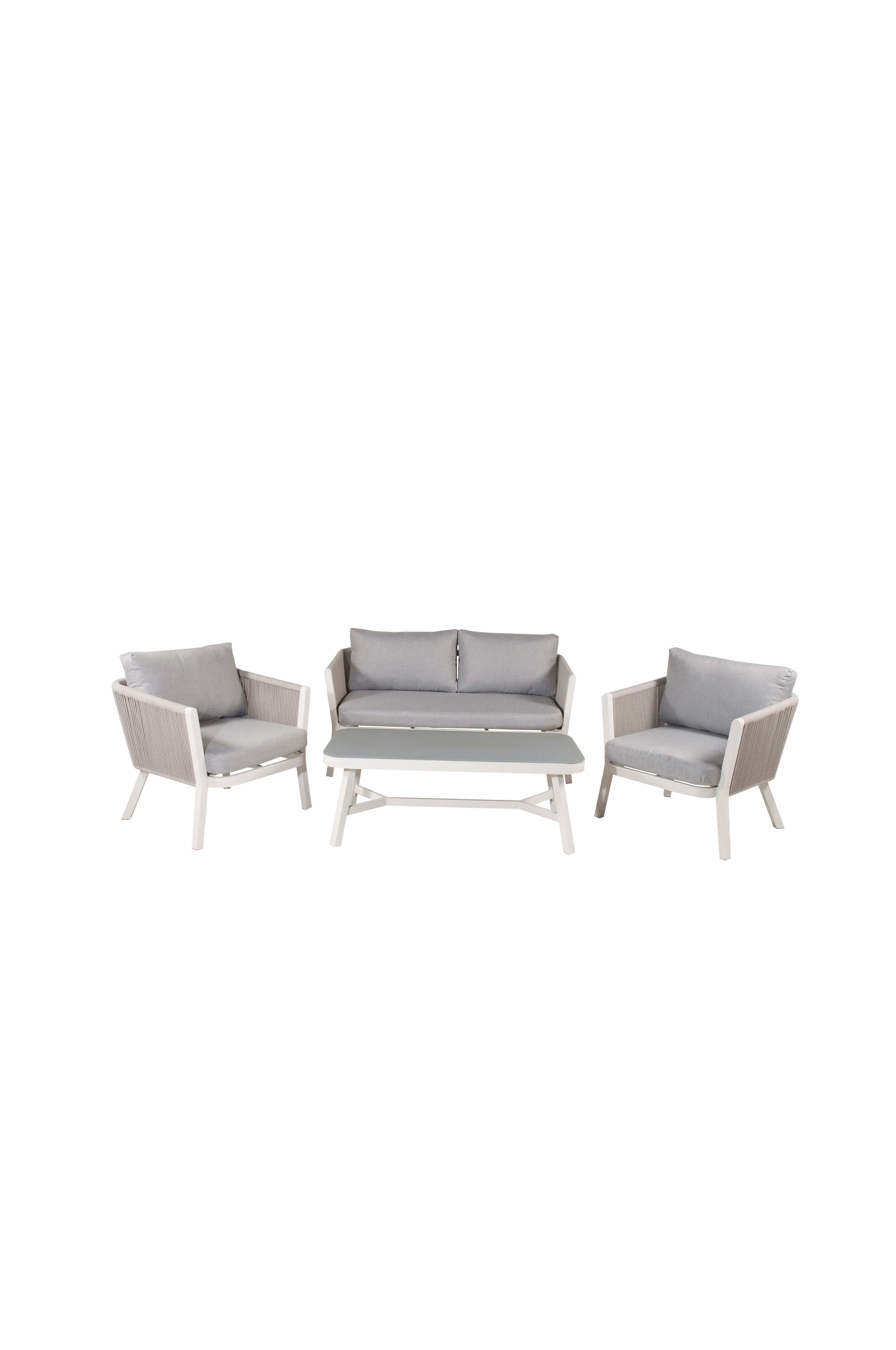 Virya on moderni ja mukava loungeryhmä, joka sopii täydellisesti ulkotilaan tai terassille. Huonekaluryhmään kuuluu kahden istuttava sohva ja kaksi nojatuolia, joissa on jauhemaalattu runko ja selkänoja vaaleaa narua. Ryhmään sisältyvät myös pehmeät pehmusteet ja suorakaiteenmuotoinen matala sohvapöytä, jonka viimeistely sopii yhteen narun ja pehmusteiden sävyn kanssa ja antaa ryhmälle ylellisen ilmeen. Nauti kesäilloista mukavasti viihtyisässä sohvaryhmässä!