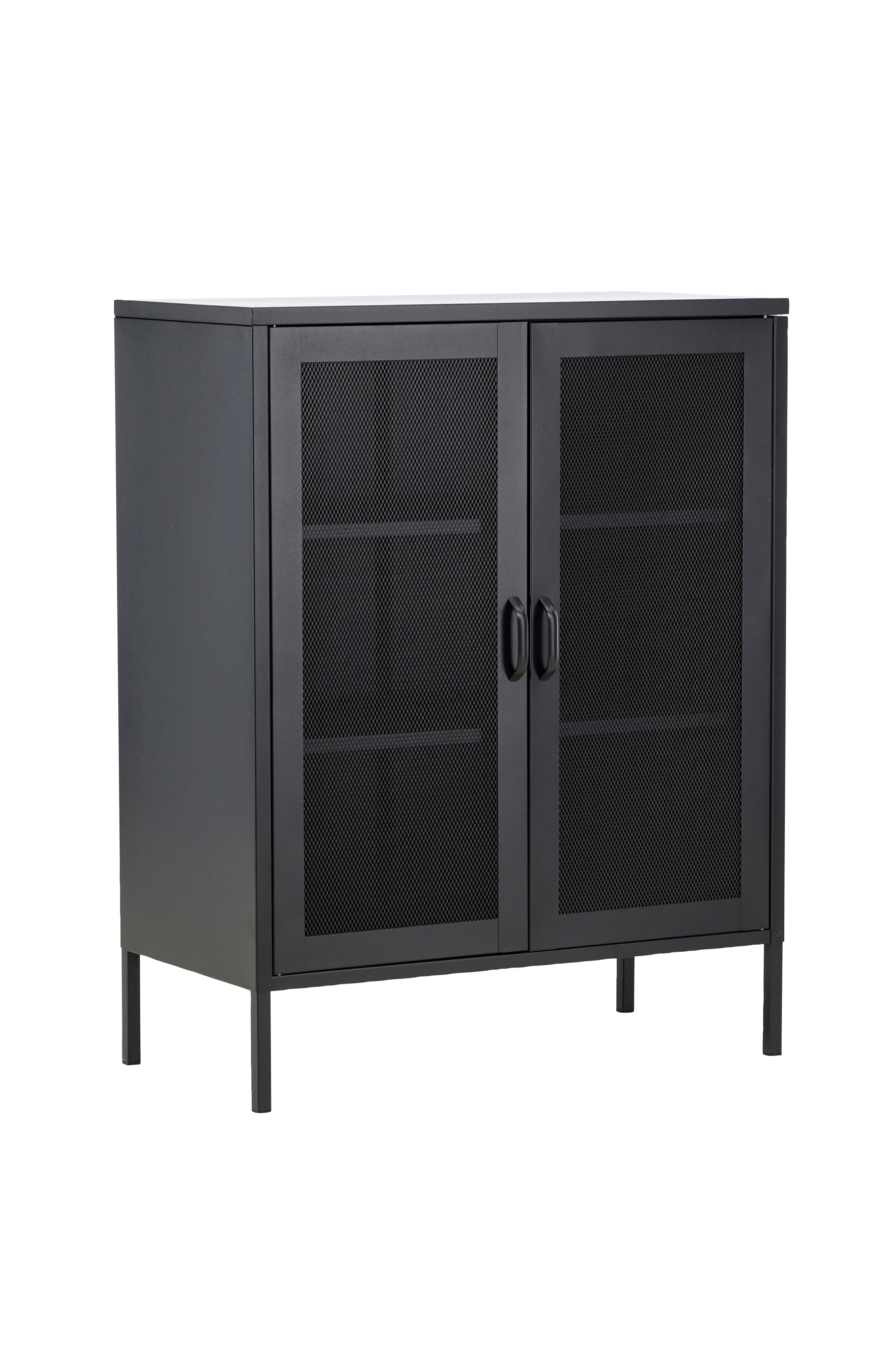 Malmby on matala vitriinikaappi maalattua terästä. Vitriinikaappi on helppo koota.