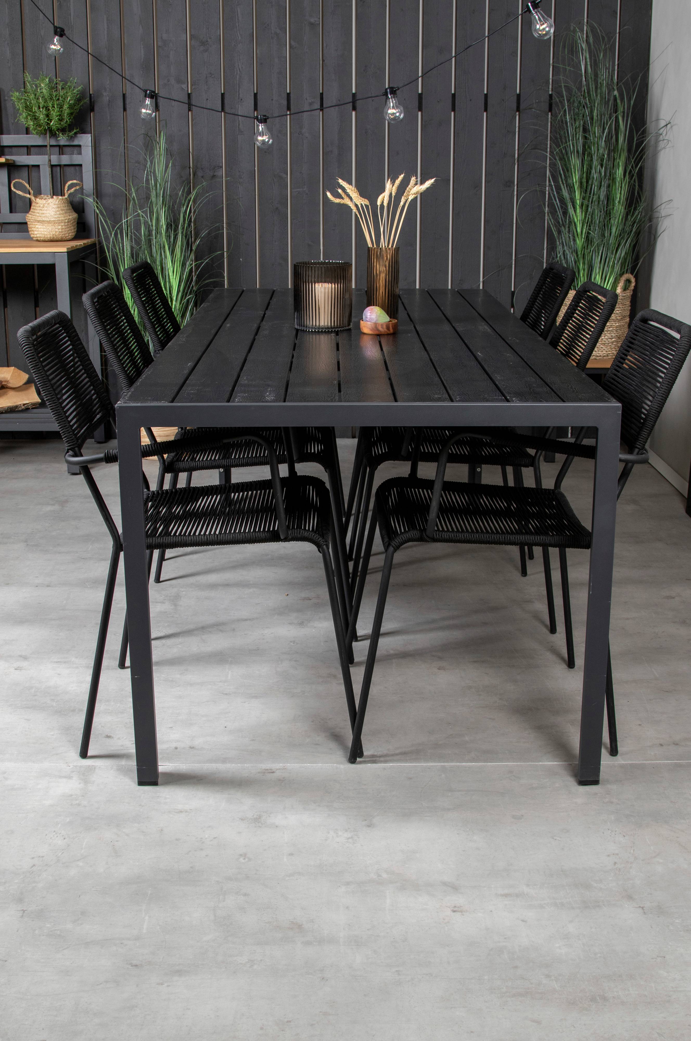 Bliss-ruokapöytä, jossa pöytälevy aintwood-materiaalia ja jalat alumiinia. Pöydän mitat: Pituus: 205 cm, leveys: 90 cm, korkeus: 74 cm. 6 Levis-tuolia, joissa narua ja alumiinijalat. Tuolin mitat: Kokonaiskorkeus: 85 cm, leveys: 55 cm, syvyys: 66 cm, istuinkorkeus: 47 cm. Pöytä ja tuolit on helppo koota.