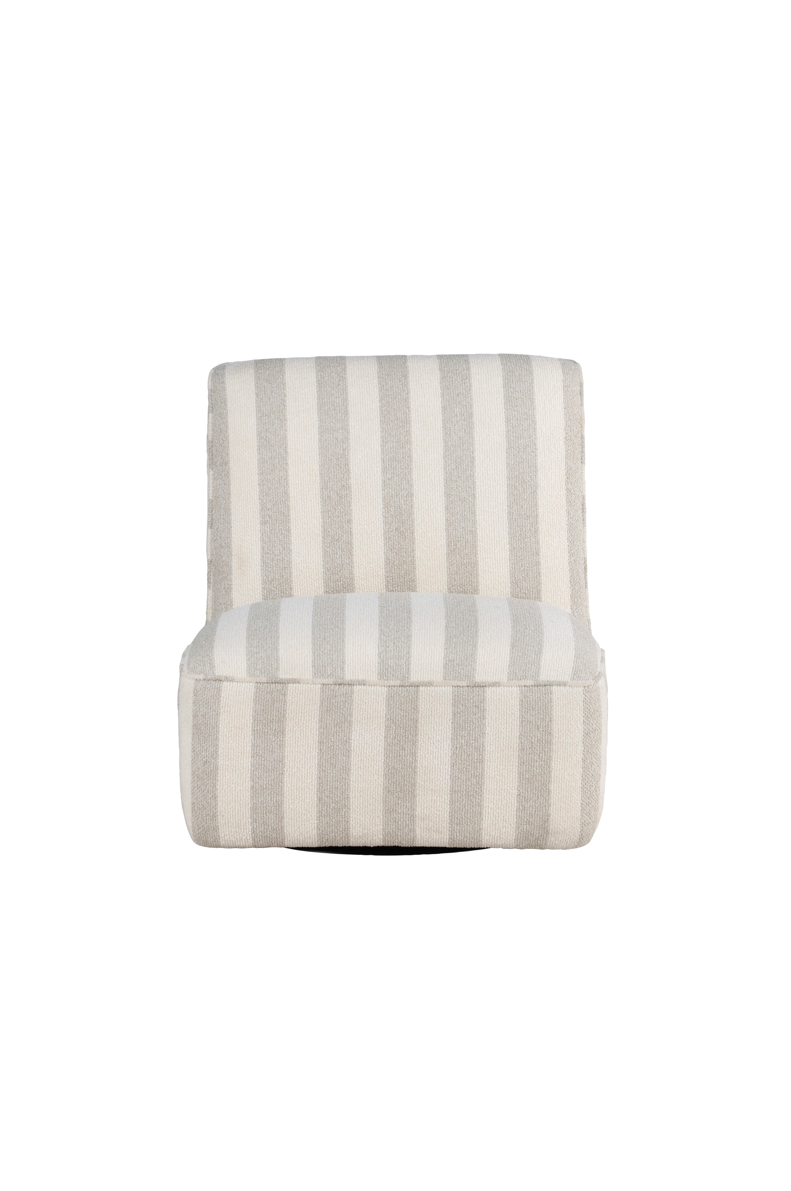 tuoli erottuu edukseen kangasverhoilullaan, jossa on leveät valkoiset ja beigen väriset raidat, jotka antavat tuolille leikkisän mutta tyylikkään ilmeen. Minimalistisen muotonsa ansiosta my sopii yhtä hyvin olohuoneeseen kuin makuuhuoneeseen tai eteiseen - joustava ja tyylikäs nojatuoli moderniin kotiin.